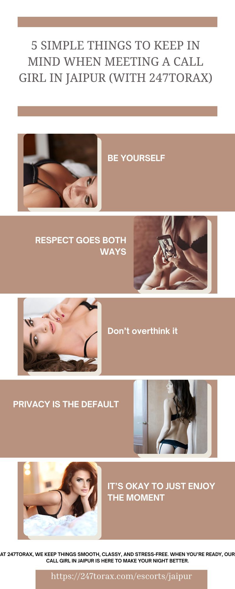 Before meeting a call girl in Jaipur, take a breath and keep it simple. That’s the vibe behind this infographic from 247torax—5 low-key reminders to make the experience smooth and easy. Show up as you are. Keep things respectful. Don’t try too hard. It’s not about perfection, it’s about comfort. The guide gently shifts the mindset from “nervous first-timer” to “calm, confident grown-up.” And honestly? That’s all you need. A call girl Jaipur experience can feel soft, relaxed, and refreshingly real—if you let it. Visit for more at https://247torax.com/escorts/jaipur