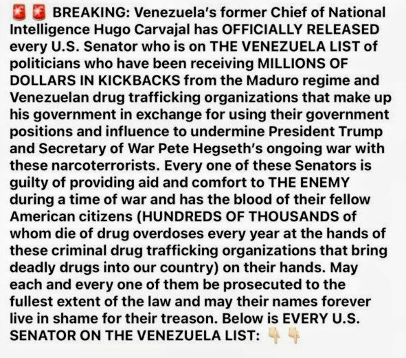 BREAKING: Venezuela’s former Chief of National Intelligence Hugo Carvajal has OFFICIALLY RELEASED every U.S. Senator who is on THE VENEZUELA LIST of politicians who have been receiving MILLIONS OF DOLLARS IN KICKBACKS from the Maduro regime and Venezuelan drug trafficking organizations that make up his government in exchange for using their government positions and influence to undermine President Trump and Secretary of War Pete Hegseth’s ongoing war with these narcoterrorists.