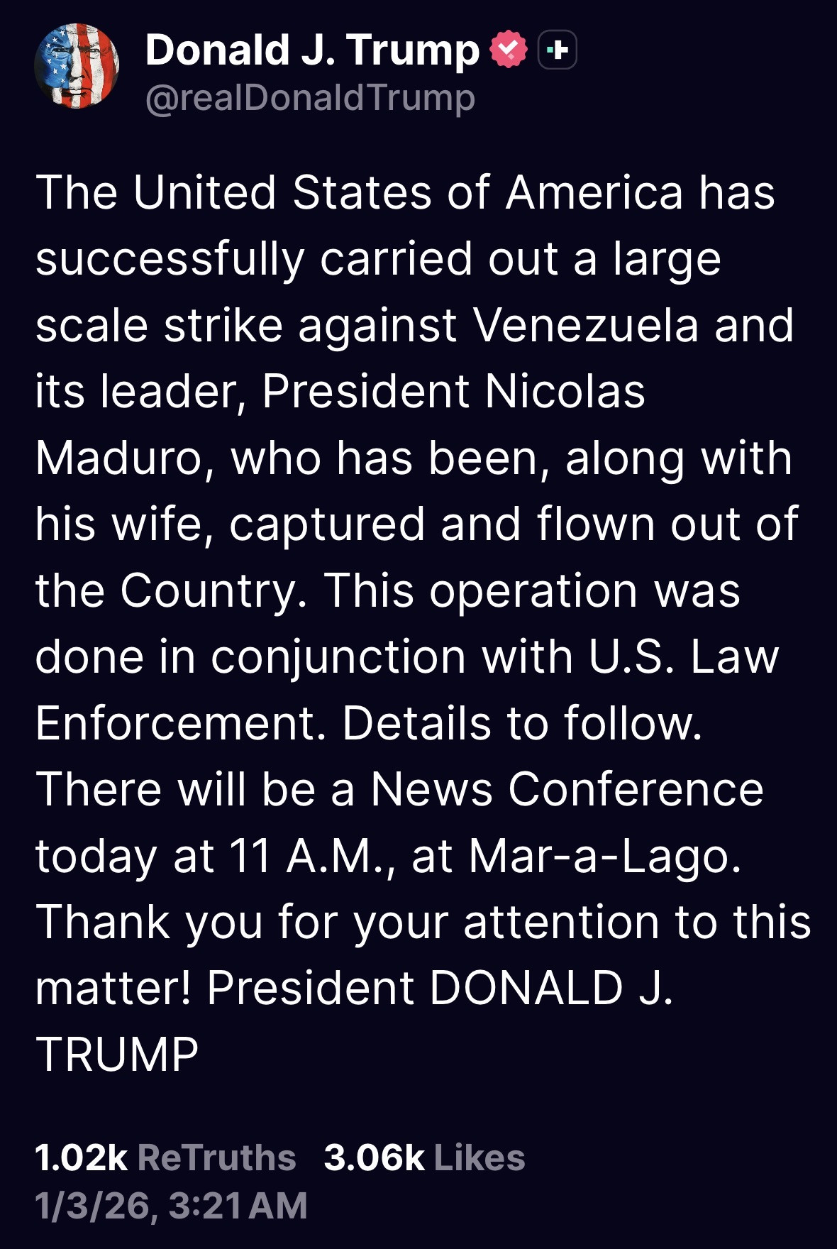 Live Updates: U.S. Captures Venezuelan Leader, Trump Says - The New York Times https://share.google/fkVMqSnweTrJktC5p