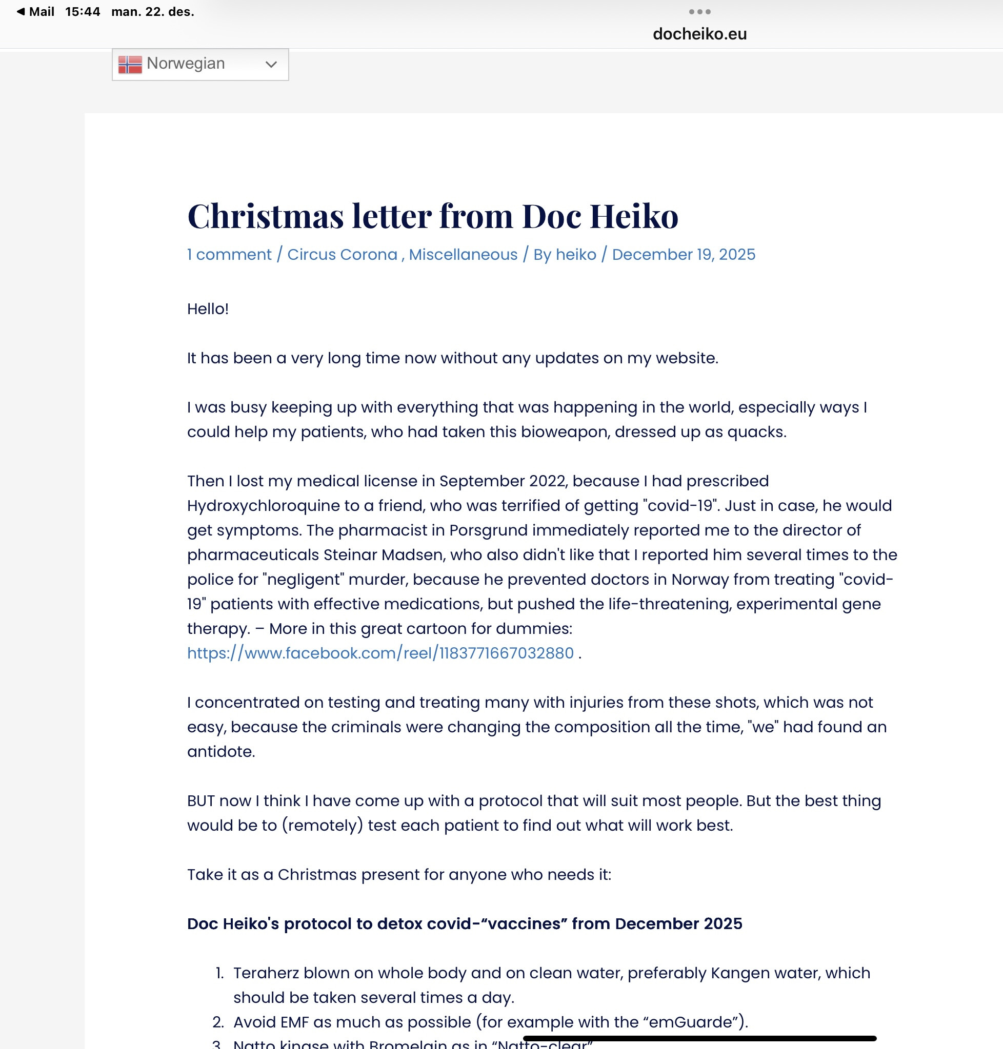 Hello! Nå har det gått veldig lang tid uten noen oppdateringer på min nettside. Jeg var opptatt med å følge med på alt som skjedde i verden, spesielt på måter jeg kunne hjelpe mine pasienter med, som hadde tatt dette biovåpen, kledd ut som kvaksine. Så mistet jeg min legelisens i september 2022, for..