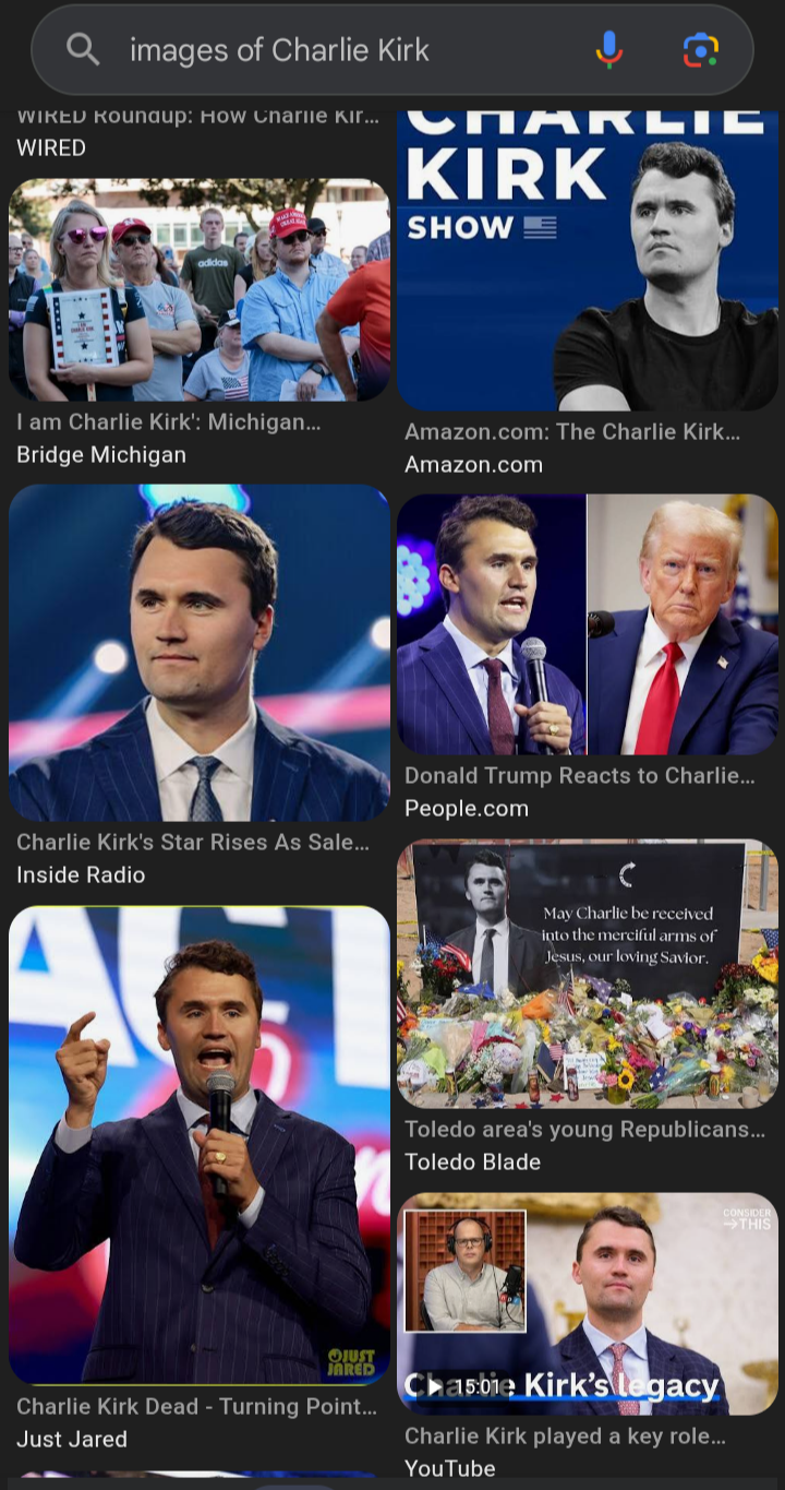 GOOGLE SEARCH CHARLIE KIRK IMAGES AND HE'S ALWAYS WEARING A SUIT OR DARK COLORED T-SHIRTS.