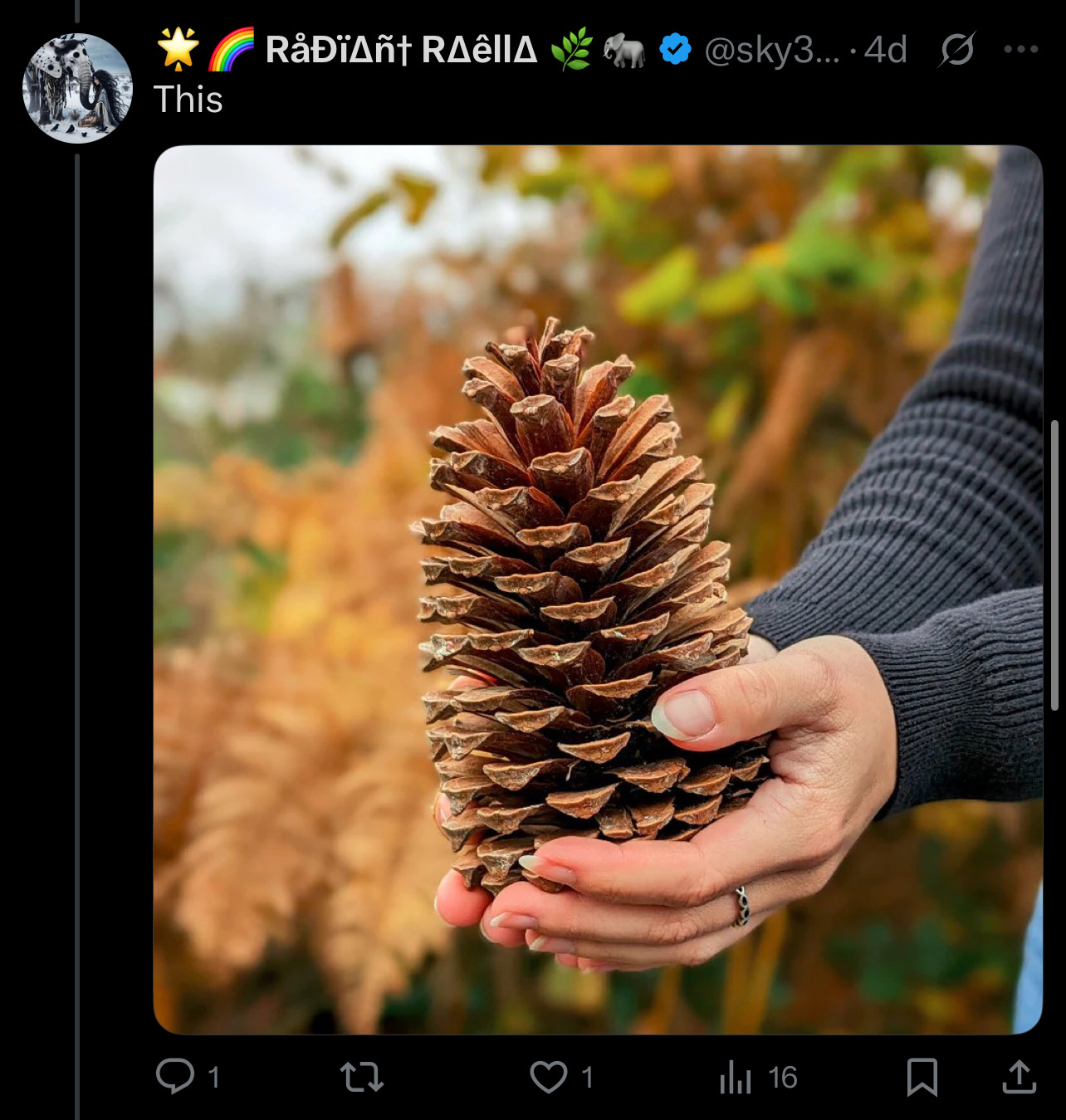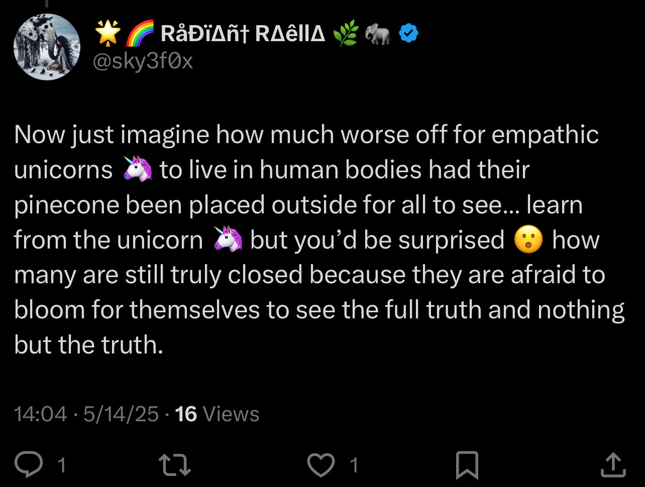 To kinda compare the brain 🧠 a neuro typical brain where only certain areas light up and a neurodivergent brain is to also compare it to how a pinecone fully expands once it’s in its prime stage (all areas of the brain activated) and not just emphasized on one side or the other.