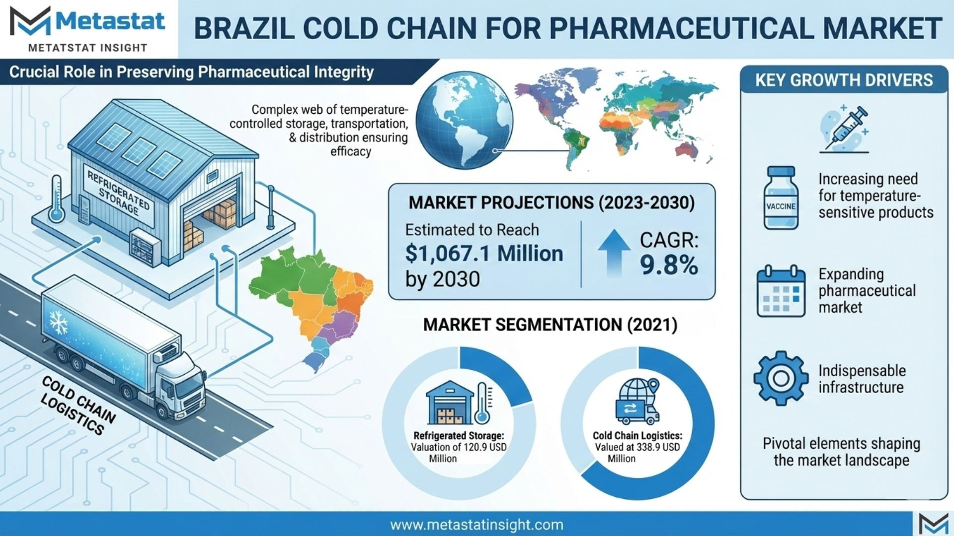 According to Metastat Insight-style structured analysis, the Brazil Cold Chain for Pharmaceutical Market is projected to reach USD 1,067.1 million by 2030, exhibiting a CAGR of 9.8% from 2023 to 2030. Cold Chain Logistics dominates (USD 338.9 million in 2021 vs. Refrigerated Storage at USD 120.9 million), driven by transportation needs amid Brazil's vast geography/diverse climates.