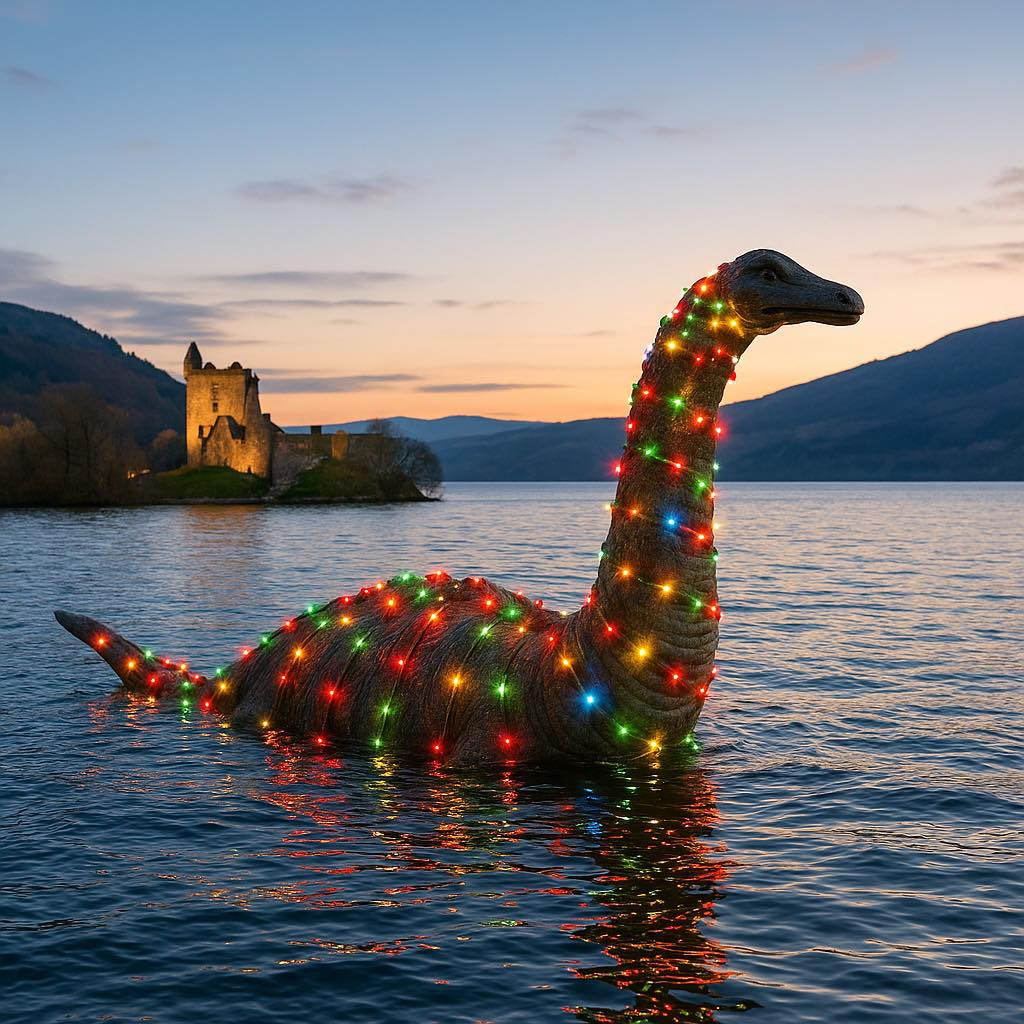 For the final twelve days before Christmas, the Loch Ness Monster is said to appear along the River Ness, wrapped in festive lights and glowing softly across the water.