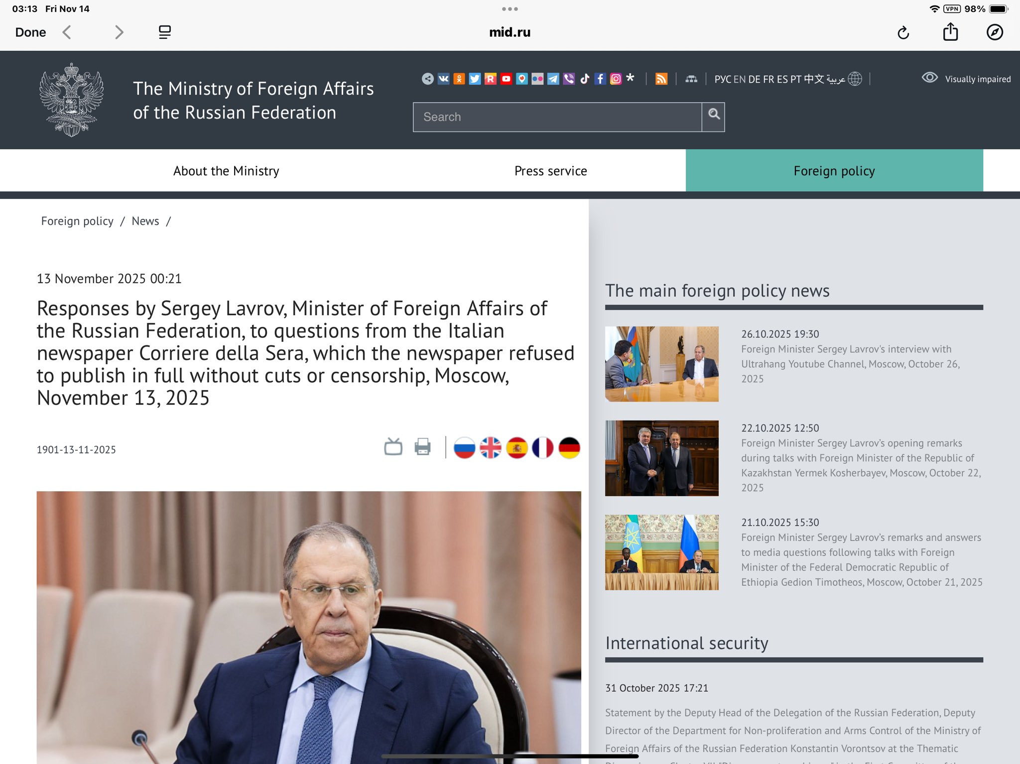 Italy’s Corriere della Sera refused to publish an interview with Sergey Lavrov — neither in print nor online.
