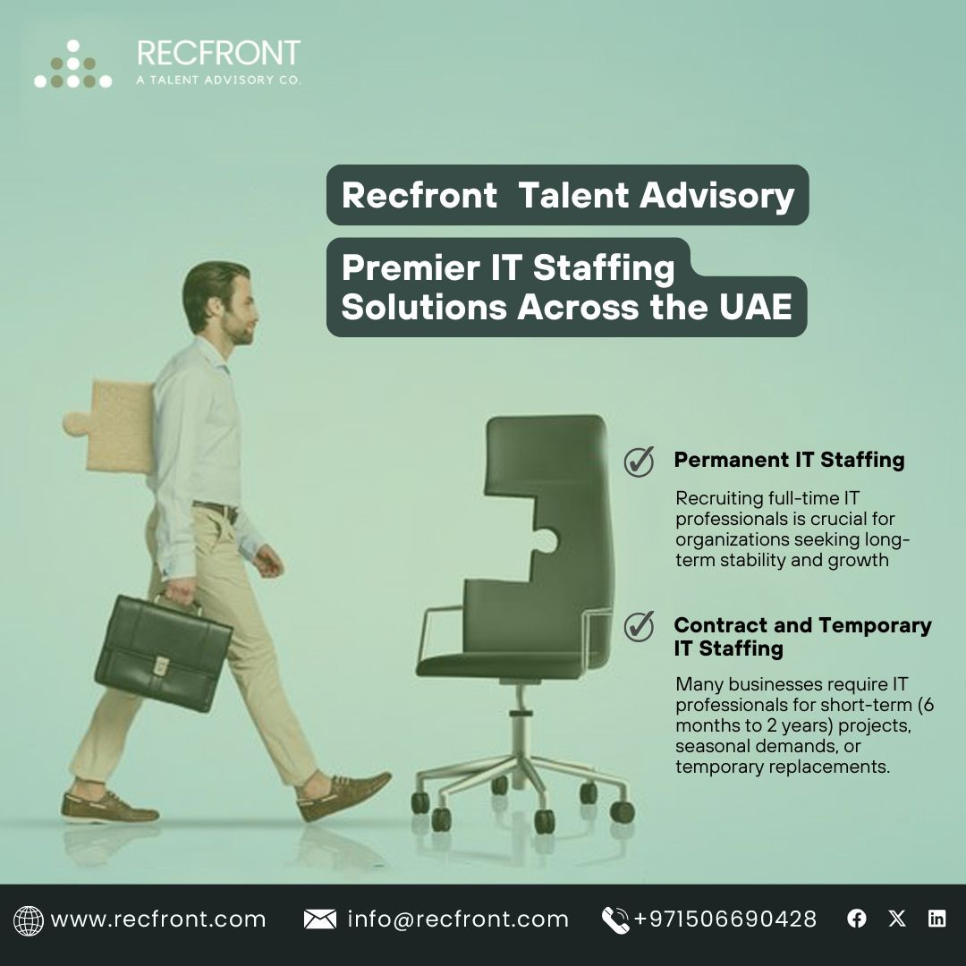 RecFront is a trusted IT staffing partner in the UAE, specializing in sourcing skilled professionals for tech-driven businesses. With expertise in contract, permanent, and project-based hiring, RecFront connects companies with top IT talent. Their customized solutions help businesses build high-performing teams, ensuring success in the rapidly evolving tech industry.