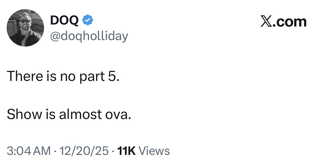 Not going to lie, I will miss Doq.....not afraid of anything coming, but Doq was a safe place to rest at times.