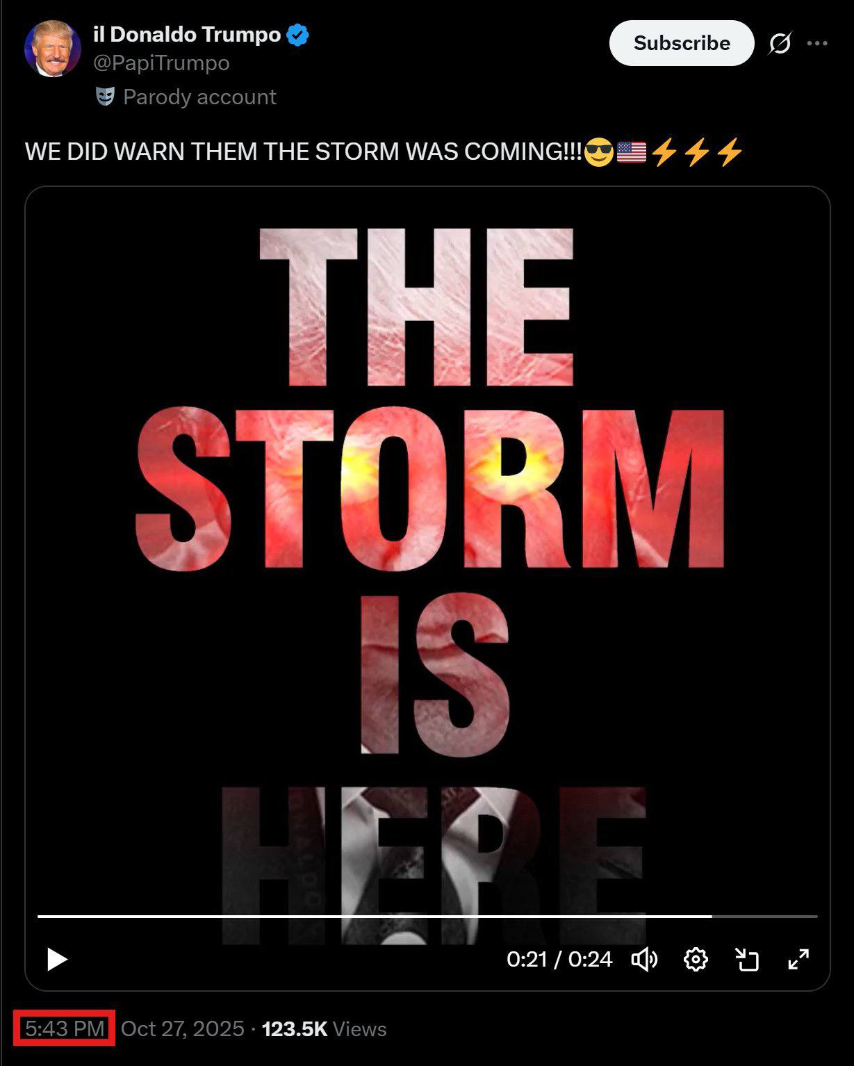 il Donaldo Trumpo's X post "WE DID WARN THEM THE STORM WAS COMING!!!" is a video that says "THE STORM IS HERE" at the end with a timestamp of 5:43 PM EST