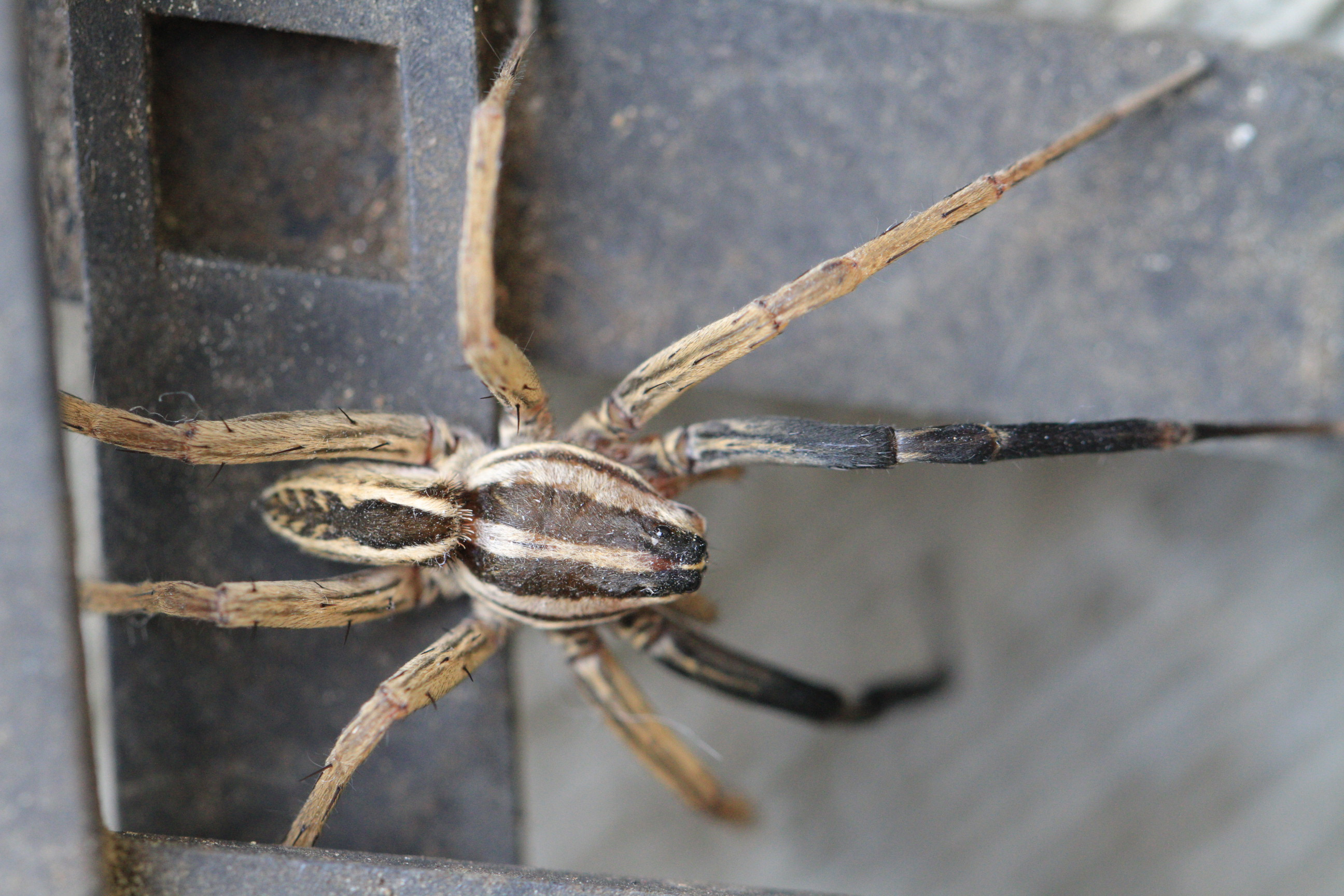 A Rabid Wolf Spider was gathering some sunlight before running quickly between some plant supports to hide, eventually crawling down into some thicker foliage on the garden floor.#RabidosaRabida#RabidWolfSpider#WolfSpider#Spider#Arachnid#Entomology#AnimalBiology#biology
