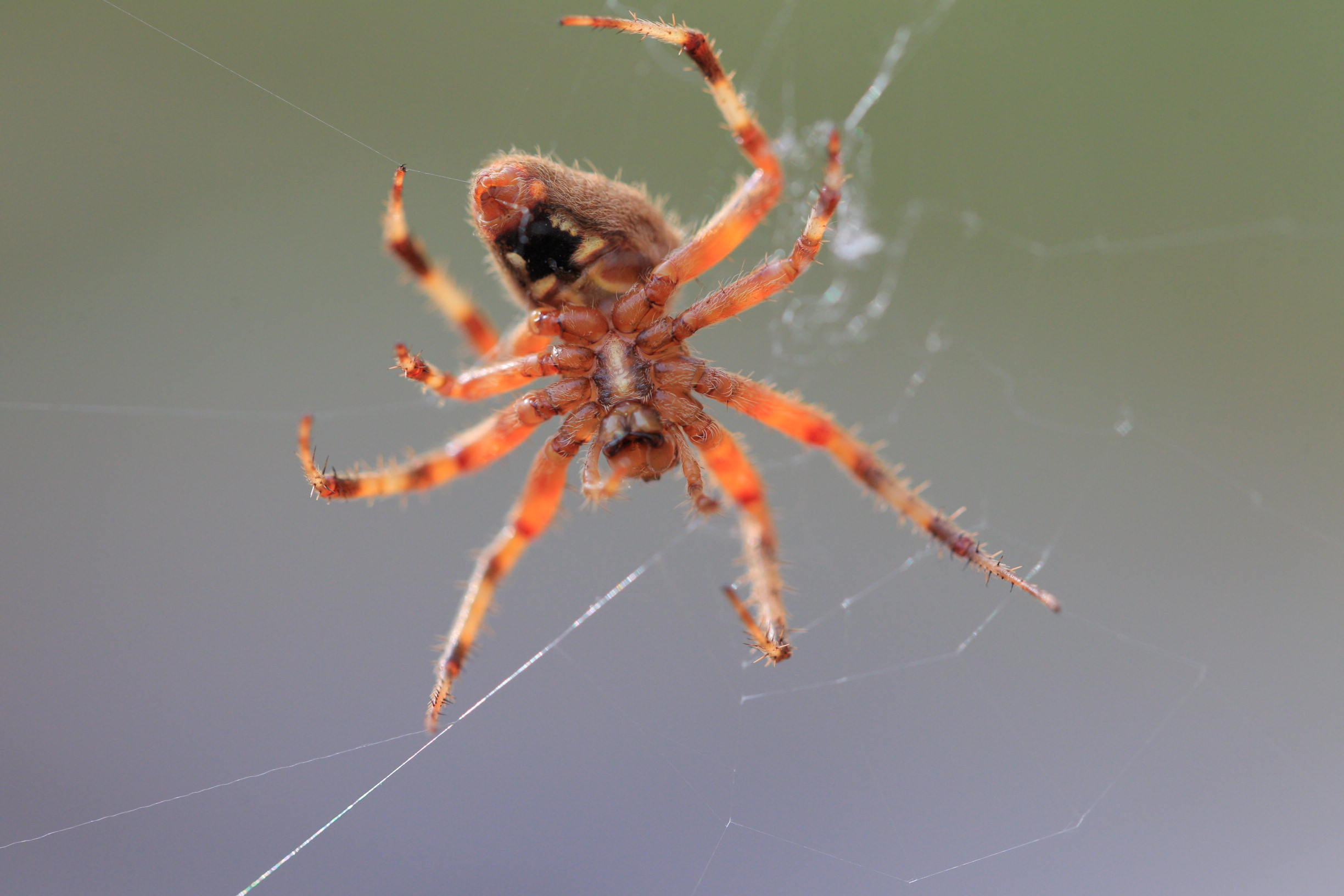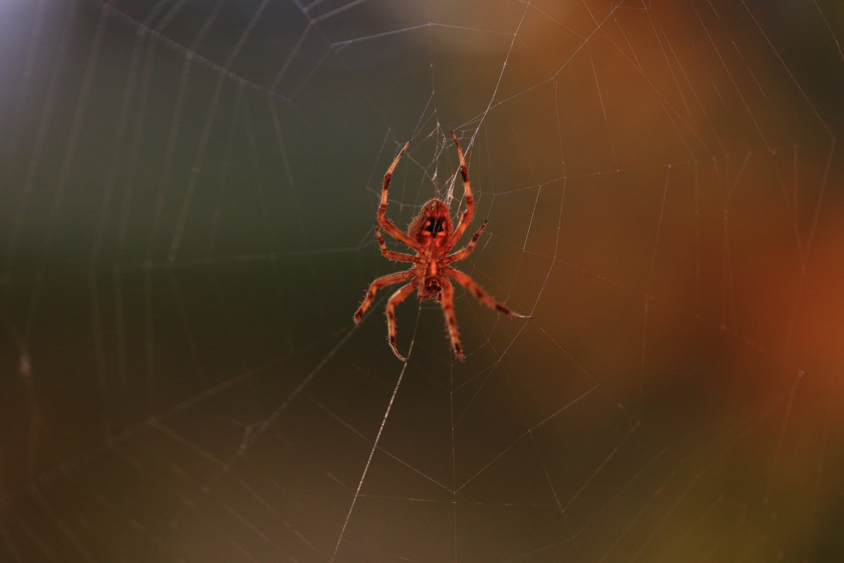 A Spotted Orbweaver spider (Neoscona crucifera) descended from a tree branch at sunset and created an intricate web between a coneflower below and the tree branch above, settling in its center for a warm November night while basking in the glow of the Halloween lights.#SpottedOrbweaver#Orbweaver#NeosconaCrucifera#spiderweb#Spider#halloween#Spooky#Entomology#AnimalBiology#biology