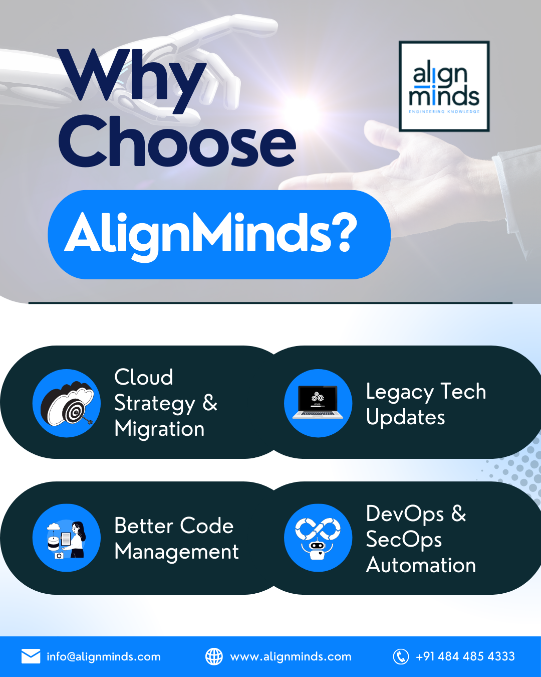 AlignMinds’ Generative AI service goes beyond text and images—enabling advanced multimodal solutions including video, audio and complex content workflows. Enterprises benefit from tailored AI models, deep integration and strategic guidance to unlock next‑level creativity and business value.