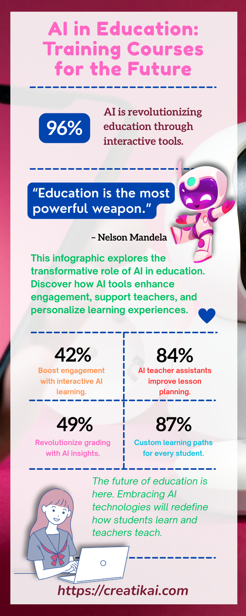 AI in education boosts learning with VR and games, helps teachers with tasks and insights, customizes lessons for each student, and makes grading faster and fairer. Visit @ https://creatikai.com/education-with-ai