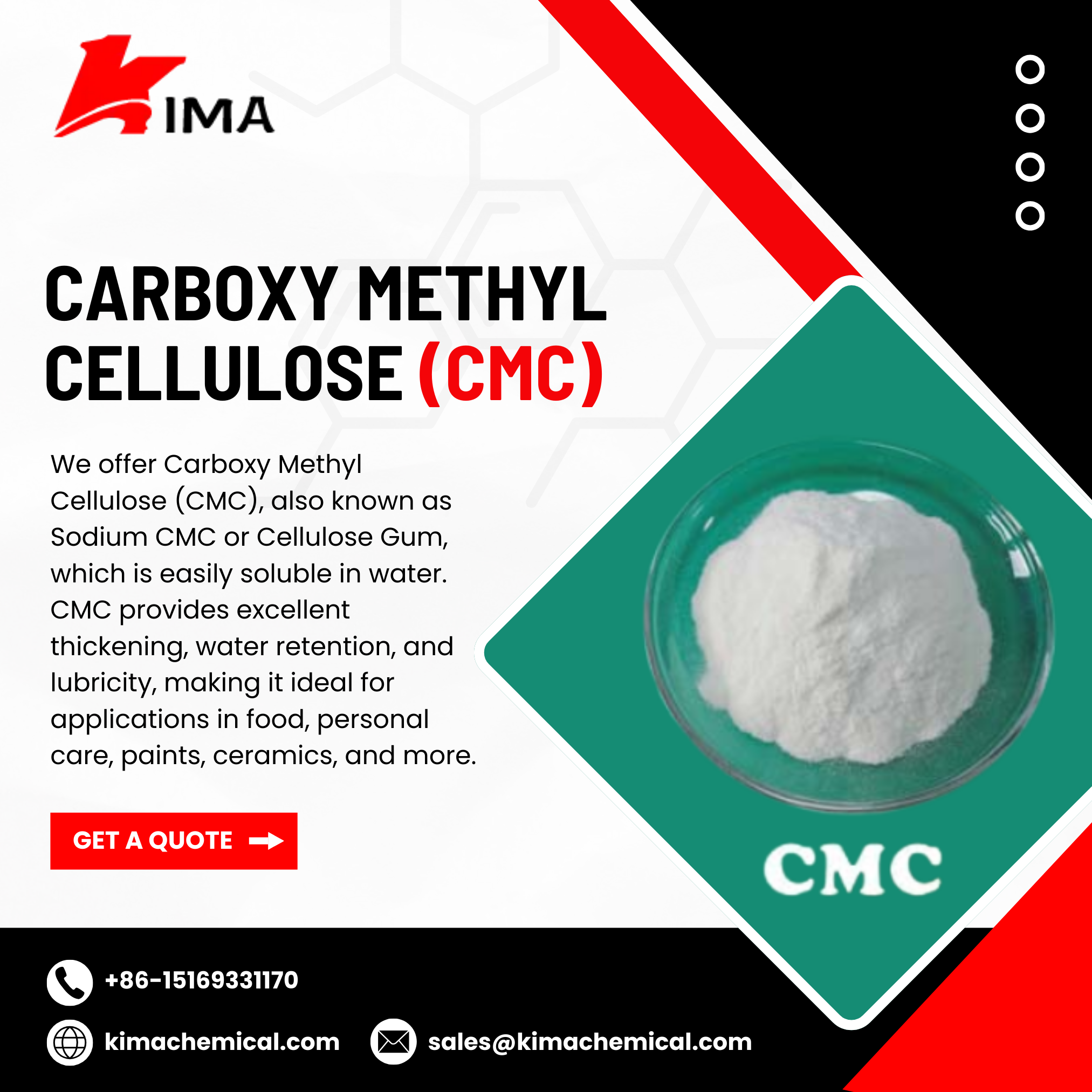 Are you looking for a reputable and high-quality carboxymethyl cellulose supplier? Kima Chemical is your best option! Our brand is known for its high-quality products and exceptional customer service. Contact us today to learn more.