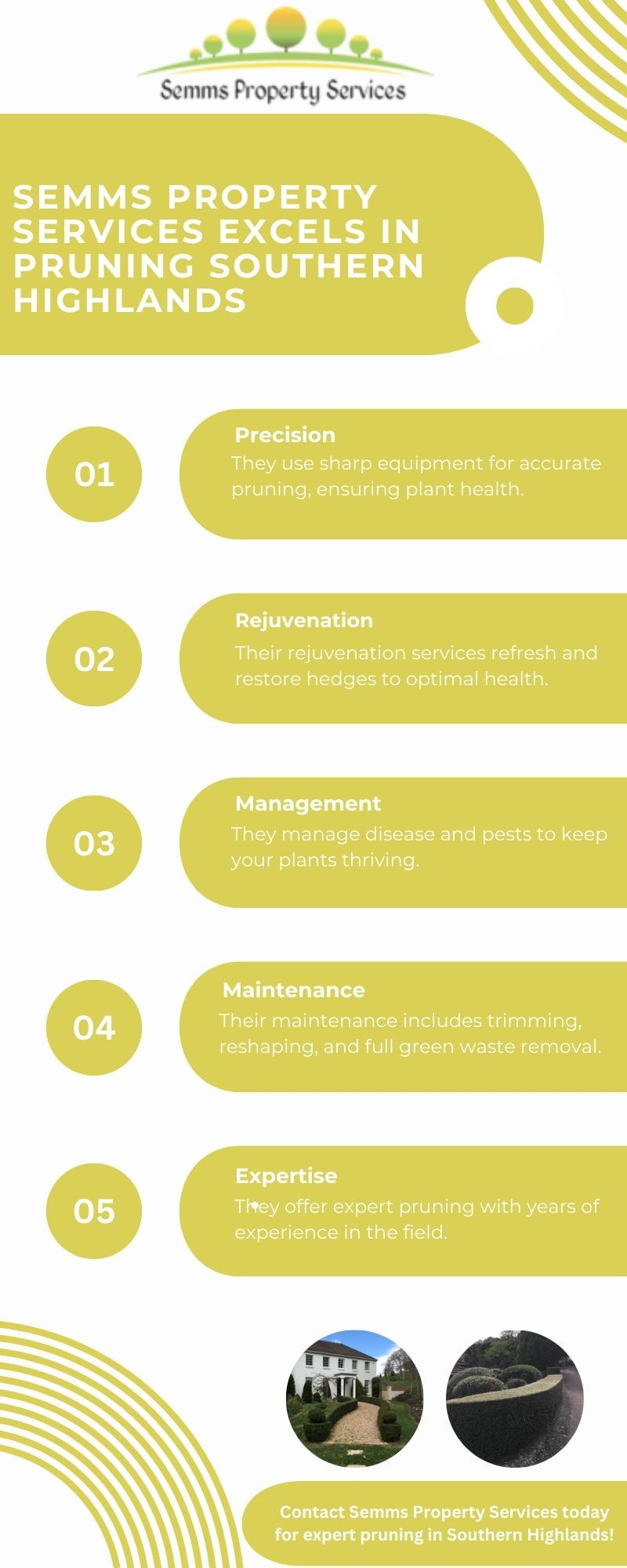 Semms Property Services provides professional pruning in the Southern Highlands. They offer precise and effective trimming, rejuvenation, and disease management for hedges and topiary. Their skilled team ensures healthy, well-maintained plants using high-quality equipment. Trust them for all your pruning needs.