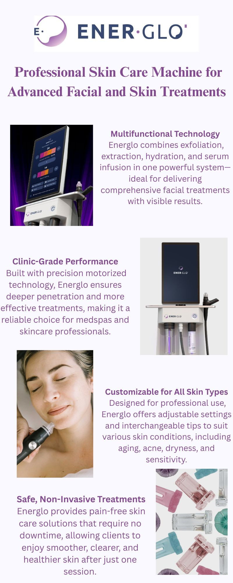 Energlo features a professional microdermabrasion machine for sale that supports high-performance skincare treatments in spas and clinics. Built with precision and ease of use in mind, Energlo’s equipment helps professionals achieve smoother, more radiant skin results. Backed by industry insight, Energlo empowers estheticians to elevate their facial services with care.