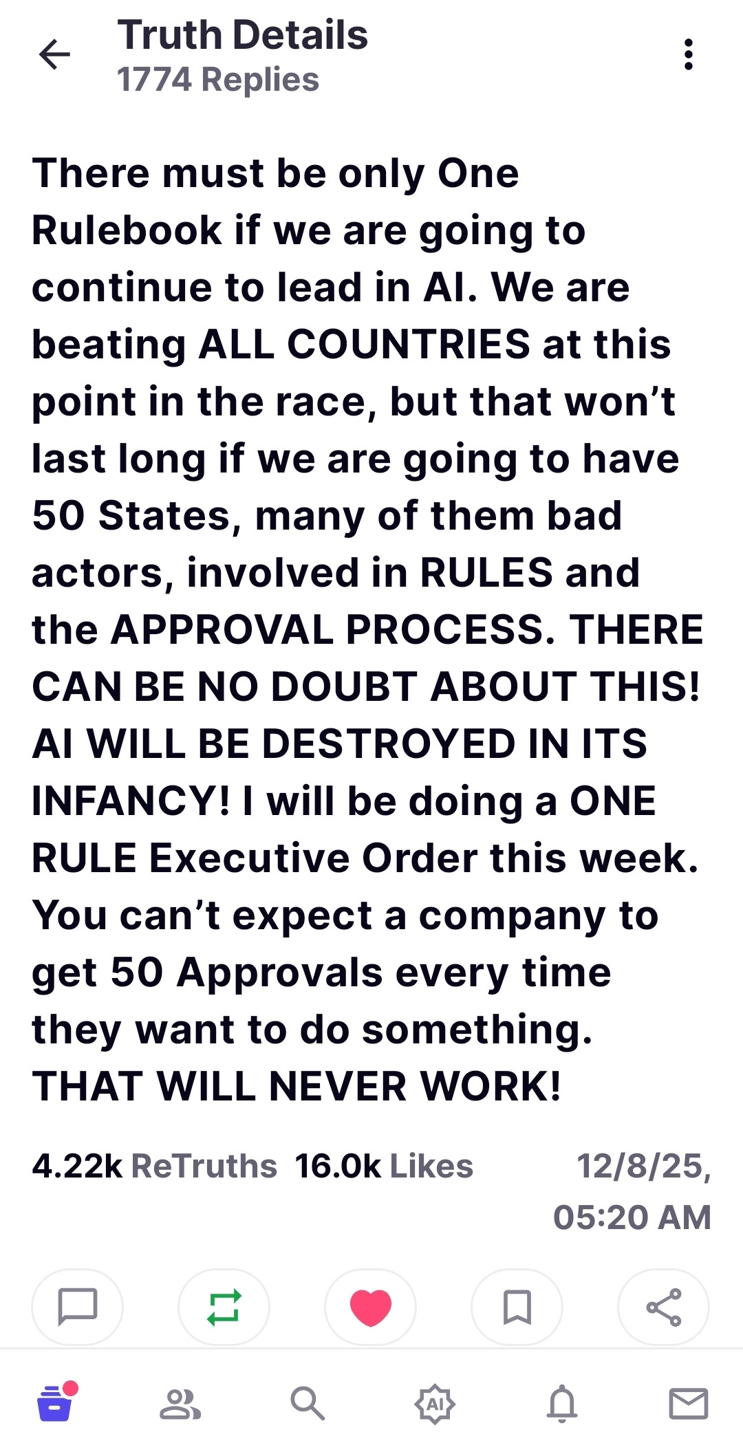 There must be only One Rulebook if we are going to continue to lead in AI. We are beating ALL COUNTRIES at this point in the race, but that won’t last long if we are going to have 50 States, many of them bad actors, involved in RULES and the APPROVAL PROCESS. THERE CAN BE NO DOUBT ABOUT THIS! AI WILL BE DESTROYED IN ITS INFANCY! I will be doing a ONE RULE Executive Order this week. You can’t expect a company to get 50 Approvals every time they want to do something. THAT WILL NEVER WORK!