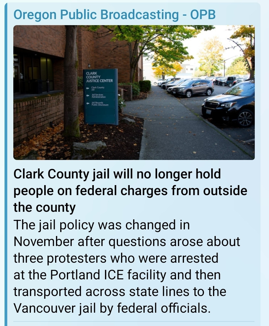 🚫The CLARK COUNTY JAIL will NO Longer Be Used to HOLD Inmates Whose CRIMES Originated OUTSIDE the COUNTY. The 'JAIL POLICY' was CHANGED! -> in NOVEMBER After Questions Arose about 'THREE-PROTESTERS' who were Arrested at the PORTLAND U.S. Immigration and Customs Enforcement Processing Facility and Then Transported Across STATE LINES to the VANCOUVER JAIL by 'FEDERAL' Officials.