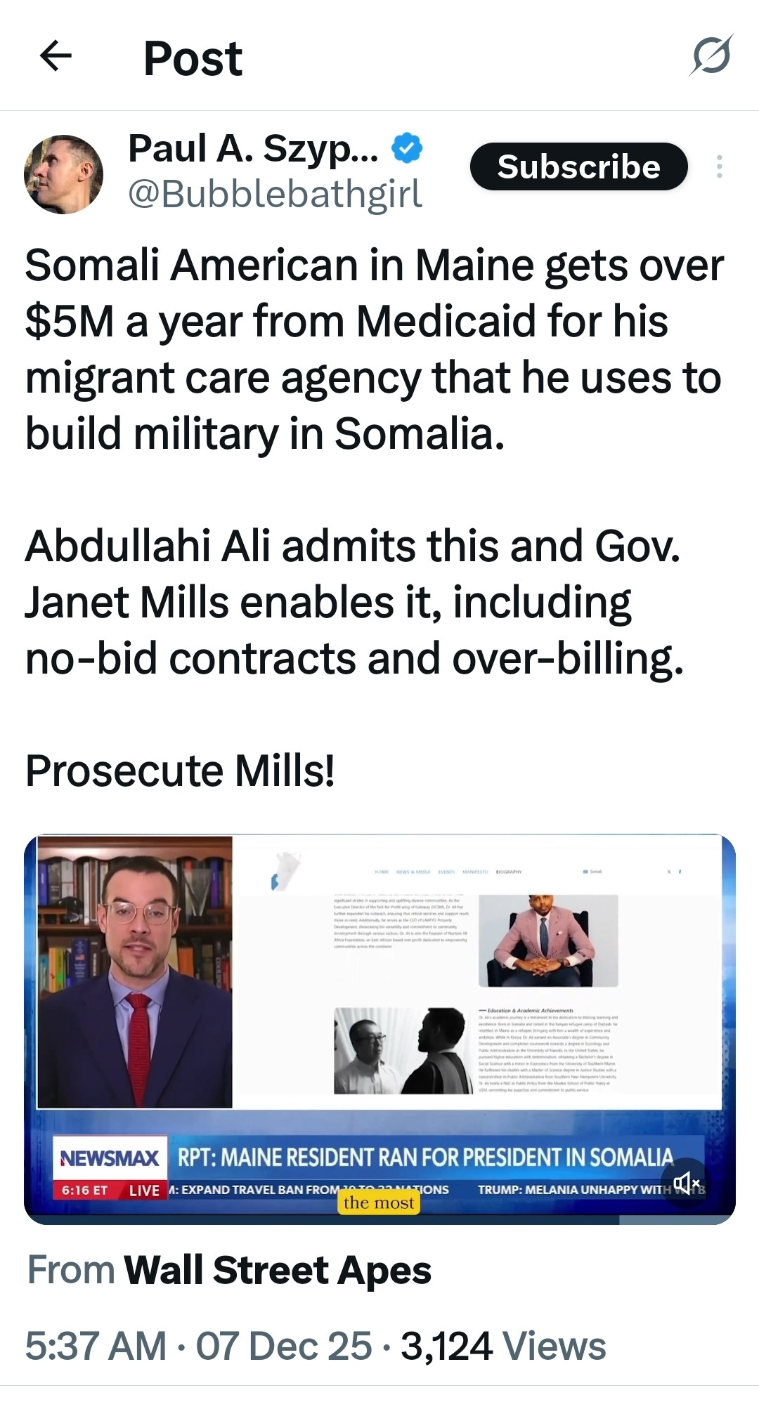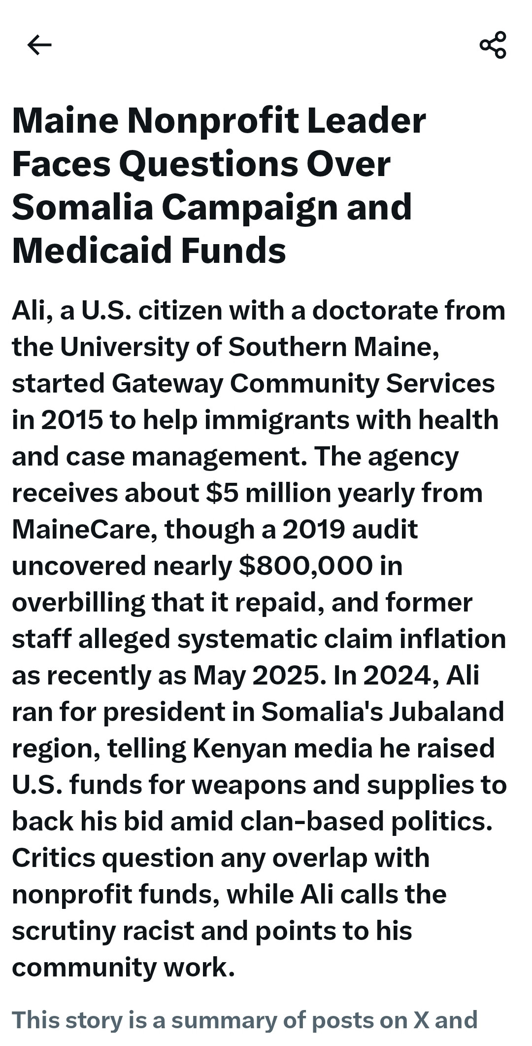 Somali American in Maine gets over $5M a year from Medicaid for his migrant care agency that he uses to build military in Somalia.