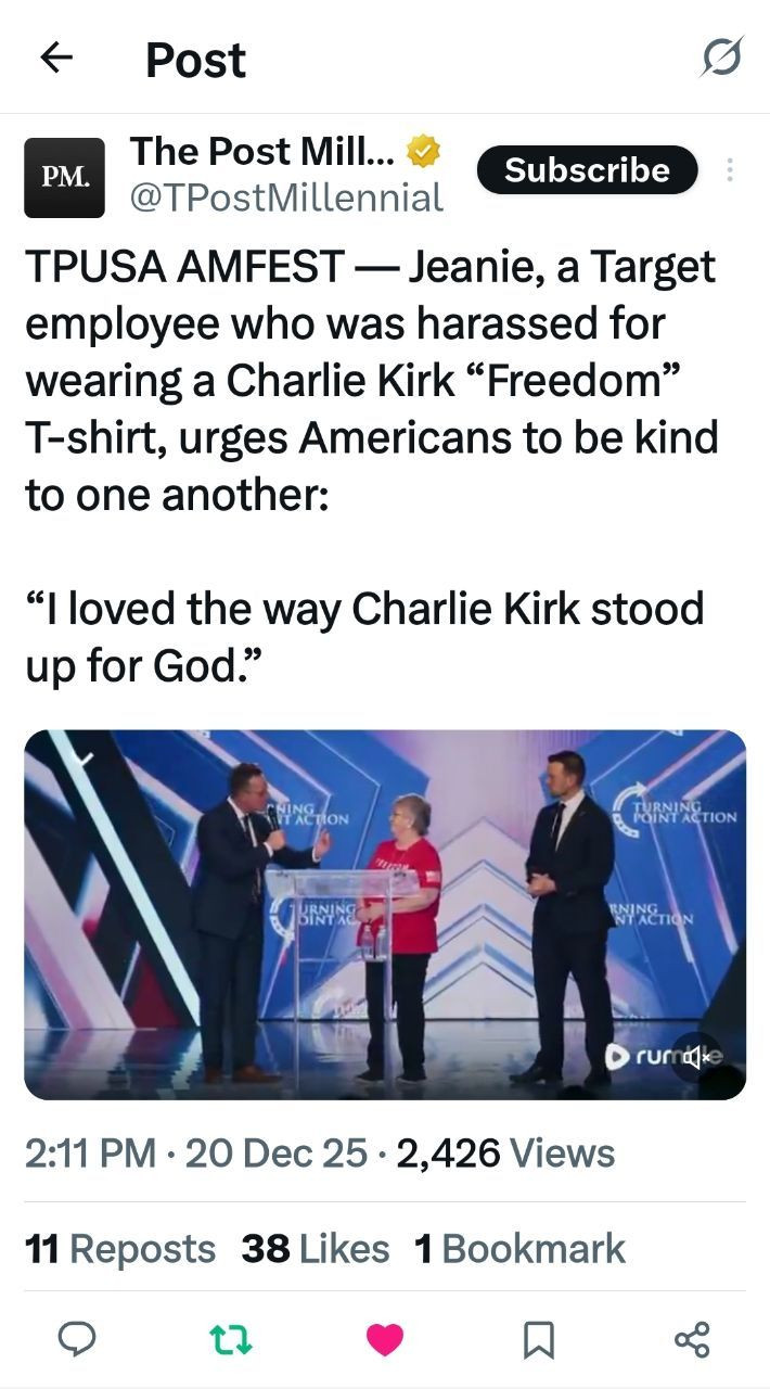 TPUSA AMFEST — Jeanie, a Target employee who was harassed for wearing a Charlie Kirk “Freedom” T-shirt, urges Americans to be kind to one another: