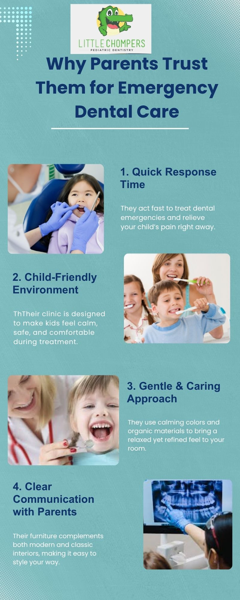 Little Chompers Pediatric Dentistry is a reliable emergency children’s dentist, offering immediate and compassionate dental care when kids need it most. Their friendly team is trained to handle urgent dental issues with care and patience. Families trust them for quick, expert treatment in a child-friendly setting.