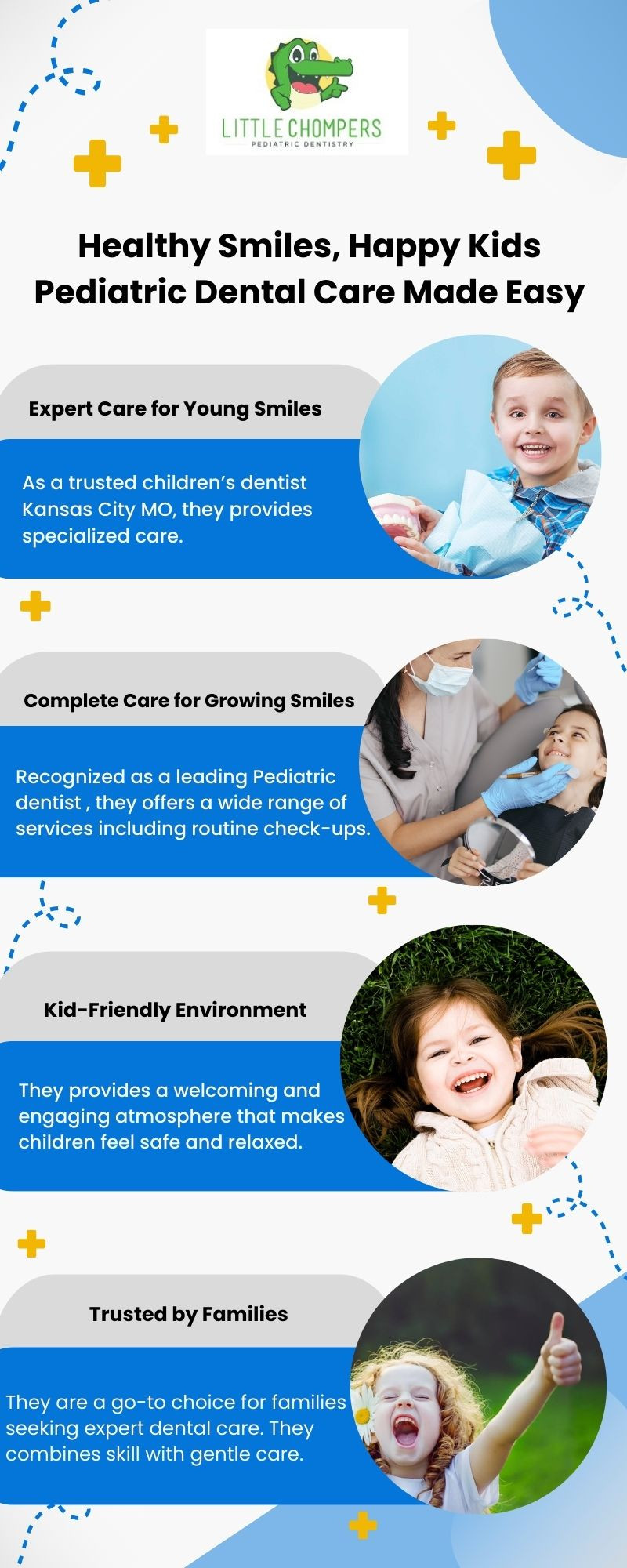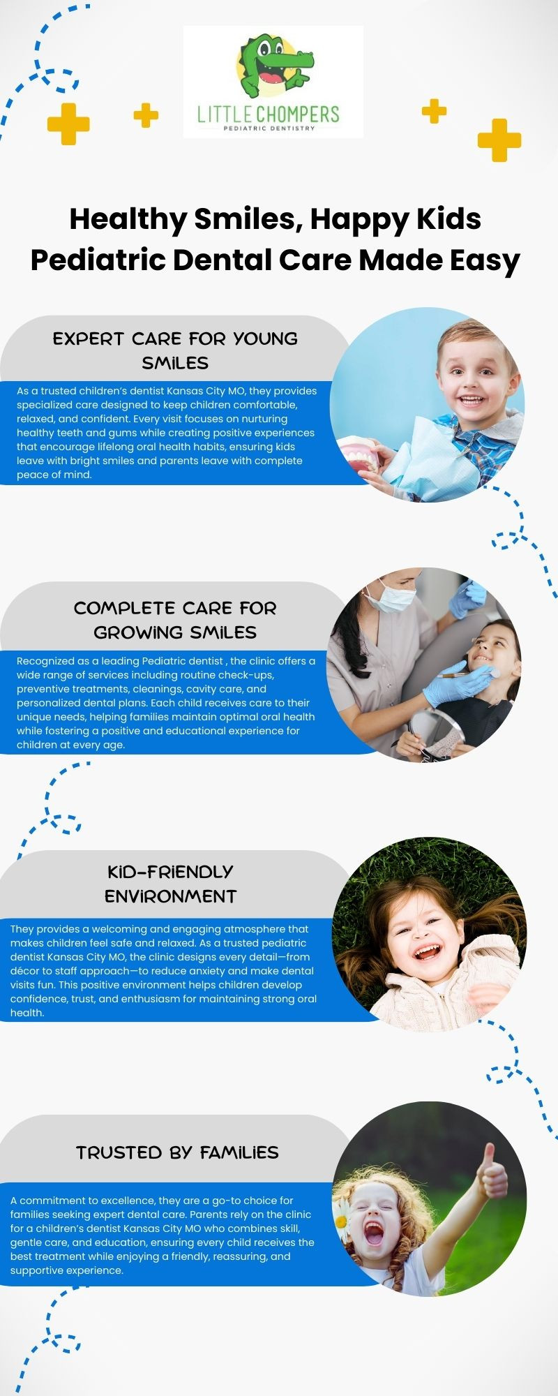 Little Chompers Pediatric Dentistry is a trusted choice for families seeking a children's dentist in Kansas City MO. The clinic is also well-regarded as a leading and a reliable pediatric dentist. With a gentle, friendly approach, they create a comfortable environment where kids feel safe while receiving expert oral care.