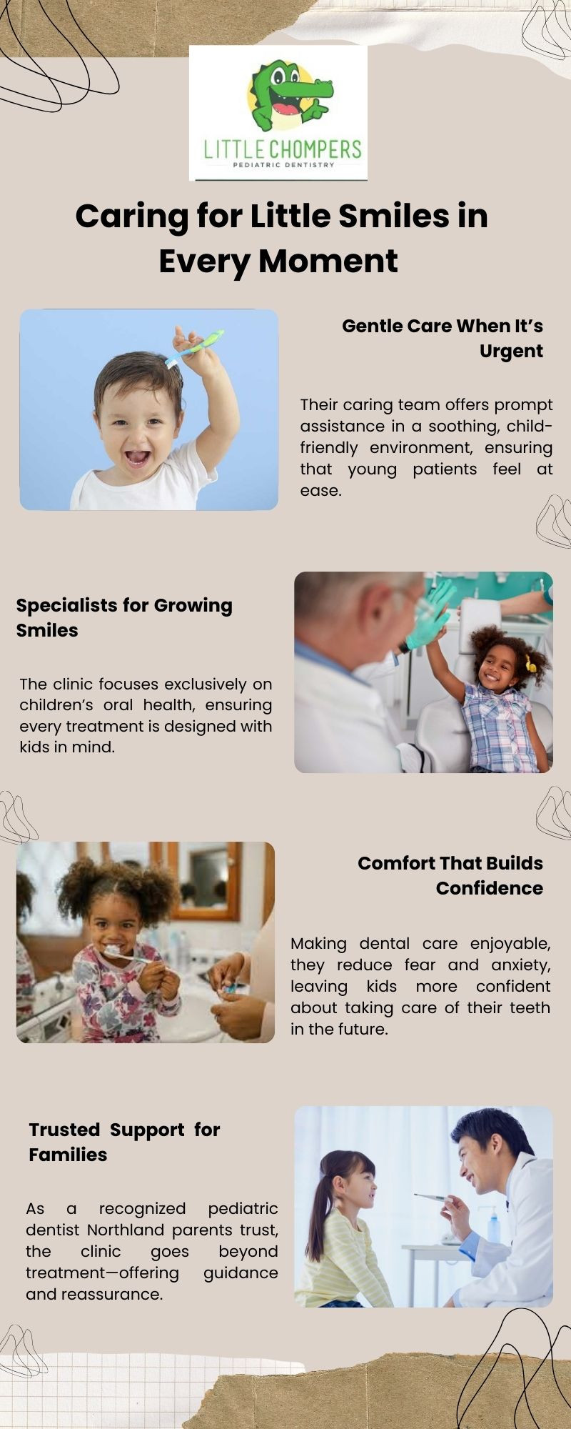 Families trust Little Chompers Pediatric Dentistry for exceptional care to young smiles. Recognized as the best Northland kids dentist, the clinic combines expertise with a welcoming, child-friendly atmosphere. With a skilled pediatric dentist Northland families rely on, Little Chompers ensures every visit is comfortable, supportive, and focused on lifelong oral health.