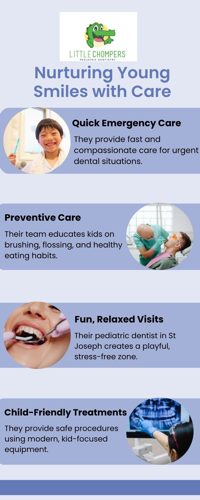 Little Chompers Pediatric Dentistry is a caring pediatric dentist in St. Joseph, MO, offering gentle and personalized dental care for children. They create a fun, welcoming environment that helps kids feel safe and comfortable. Their experienced team focuses on prevention, education, and building lifelong healthy habits. Families trust their compassionate approach.