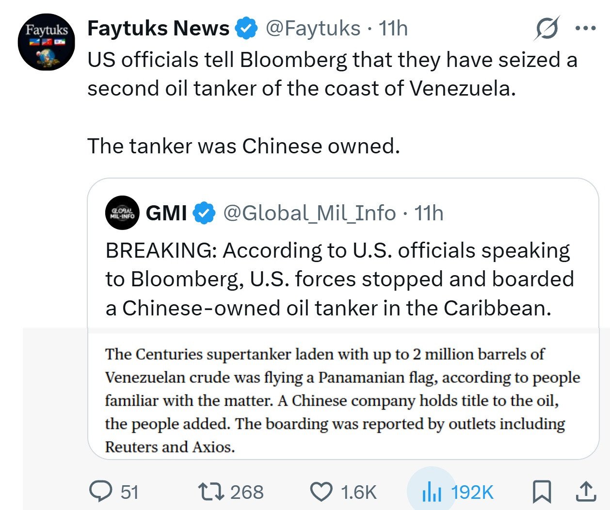 I was wondering about that, Venezuela was using a Chinese tanker to carry its crude, and people were thinking we would not stop them, they got Trumped.. 😜 https://x.com/Faytuks/status/2002479902650671155?s=20