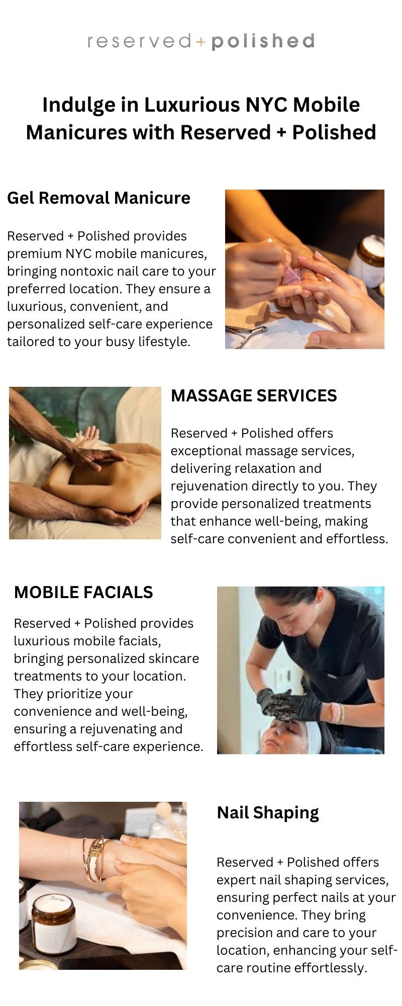 Reserved + Polished offers top-notch mobile massage in NYC, delivering relaxation right to your doorstep. They provide expert therapists and personalized treatments to meet their clients' needs, ensuring a polished and rejuvenating experience in the comfort of your home. Discover their mobile massage services today!