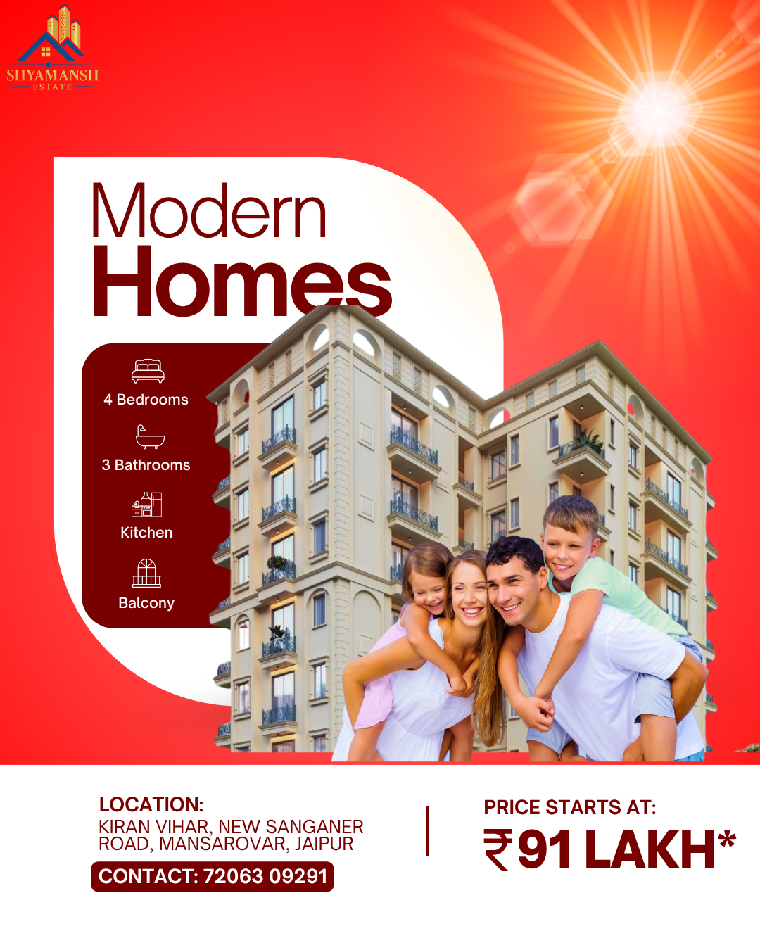 Come and have a look at premium 2,3 BHK flats built by Shyamansh Group in Jaipur, the most sought after real estate developer in Jaipur. Our flats are conveniently located along the routes of schools, hospitals and metro routes. Shyamansh Group is the leading real estate group in Jaipur with the most superior construction and smart layouts. Come to us and we will help you find the perfect home-reputable and safe to live in, luxurious, and with low costs yet has a value that will never fade. Reserve your place on a site visit now!