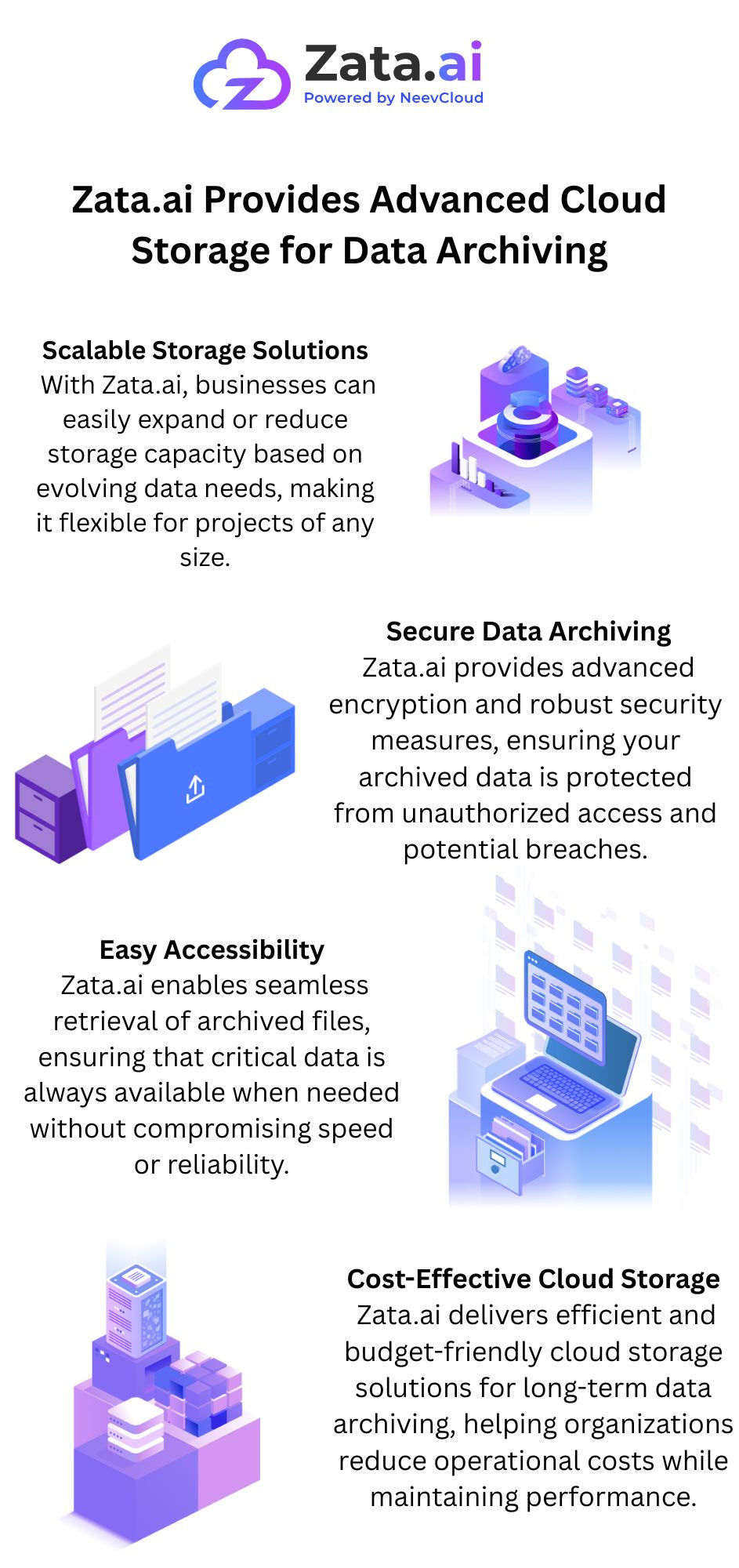Zata.ai provides advanced cloud storage for data archiving, offering secure, long-term retention solutions built for reliability and scalability. They ensure protected storage environments with strong encryption, high durability, and seamless retrieval options for historical files, compliance records, and large datasets.