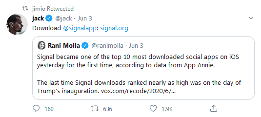 "Signal became one of the top 10 most downloaded social apps on iOS yesterday for the first time, according to data from App Annie. The app often sees spikes in downloads during tumultuous political times, but the last time Signal downloads ranked nearly as high was on the day of President Trump’s inauguration"