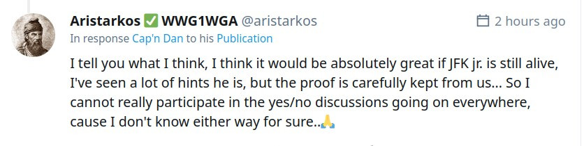 I tell you what I think, I think it would be absolutely great if JFK jr. is still alive, I've seen a lot of hints he is, but the proof is carefully kept from us... So I cannot really participate in the yes/no discussions going on everywhere, cause I don't know either way for sure..🙏