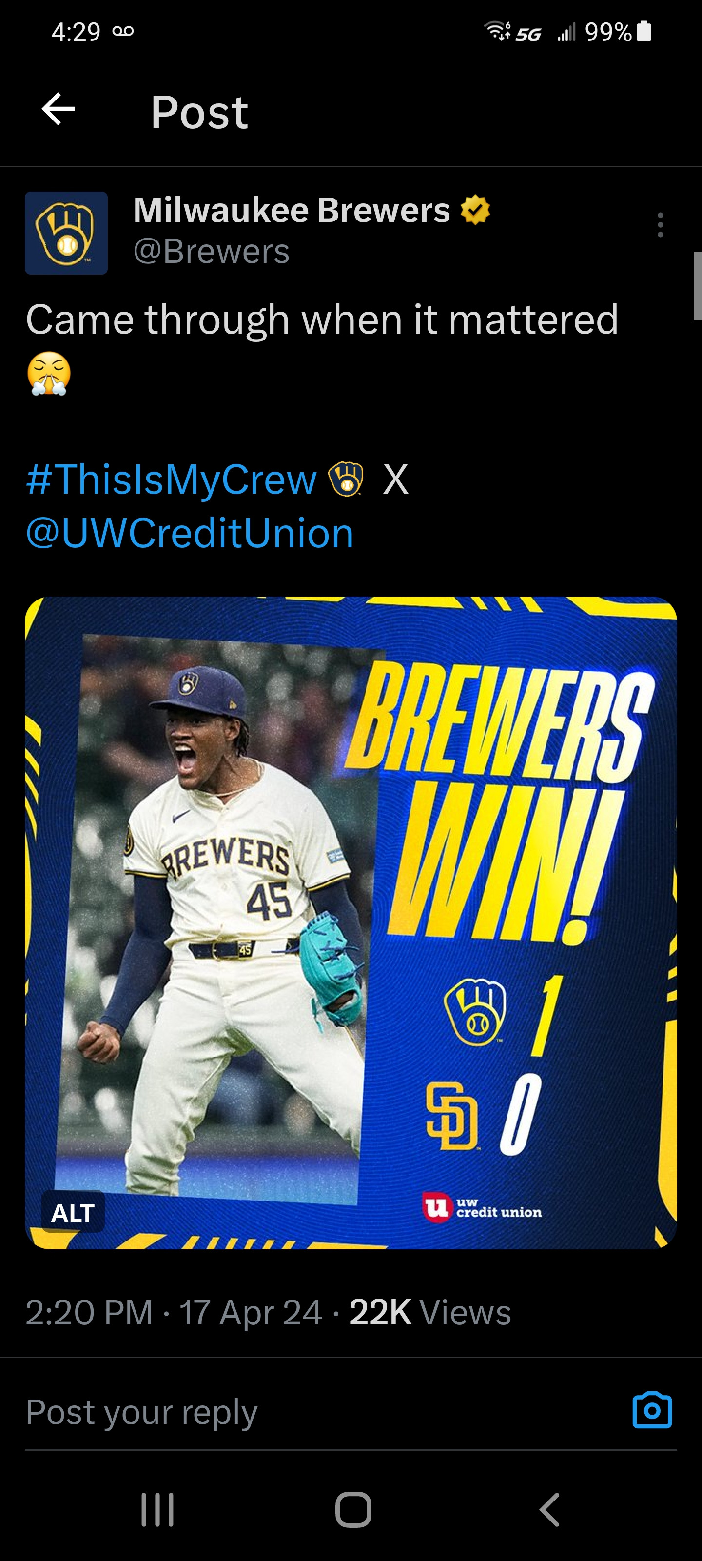 https://twitter.com/Brewers/status/1780677736874299722?t=jJbglMjZxfcBZC7g5jIn8g&s=19
