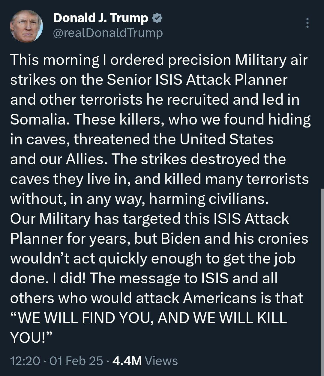 This morning I ordered precision Military air strikes on the Senior ISIS Attack Planner and other terrorists he recruited and led in Somalia. These killers, who we found hiding in caves, threatened the United States and our Allies. The strikes destroyed the caves they live in, and killed many terrorists without, in any way, harming civilians. Our Military has targeted this ISIS Attack Planner for years, but Biden and his cronies wouldn’t act quickly enough to get the job done. I did! The message to ISIS and all others who would attack Americans is that “WE WILL FIND YOU, AND WE WILL KILL YOU!”
