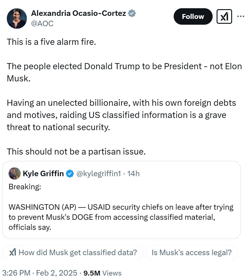 Is this some kind of code word for the Cabal? They know the USAID situation is going to cut them off. https://x.com/AOC/status/1886149143980032275#m