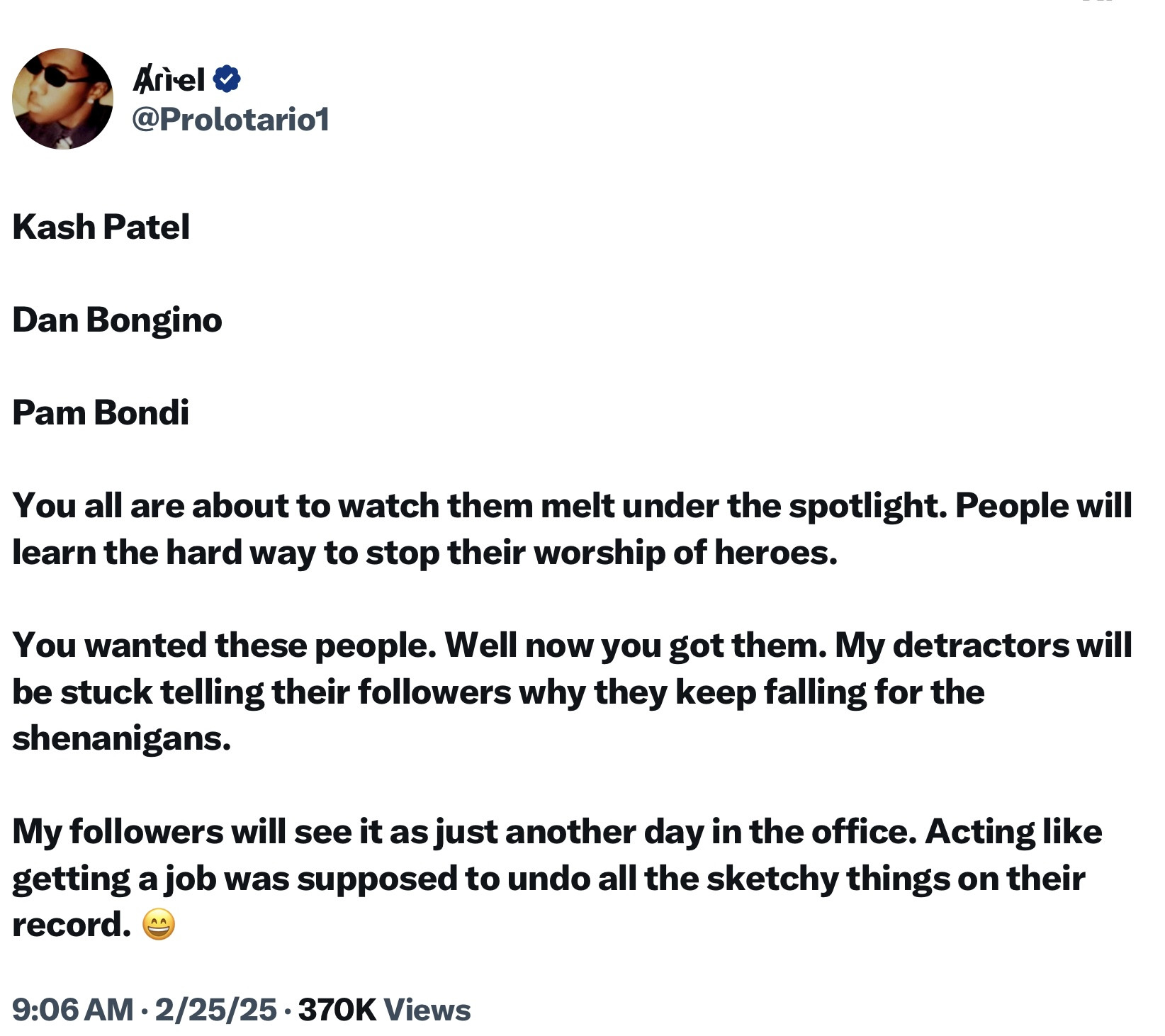 It is hard to tell who is good or bad at this point and who is playing a part but, anyone defending Israel and standing with them needs to be looked at with suspicion. They are the ones controlling the people within our government agencies etc with Epstein blackmail and their own. if you don't expose Israel for whom and what they are and what they have done and put an end to it once and for all no matter how much you expose it will never be enough if not cleansed the rot remains. Lin Wood on Telegram does an excellent job of exposing everyone's past he puts the information out there but he lets you decide what to believe and not believe. Sure some of these people could be infiltrators or plants for the good guys and are innocent their past is made up but, the majority are not, My take on all the cabinet picks is there is a reason Trump has put them in the spotlight picked them, and had them confirmed. The end won't be for everyone...