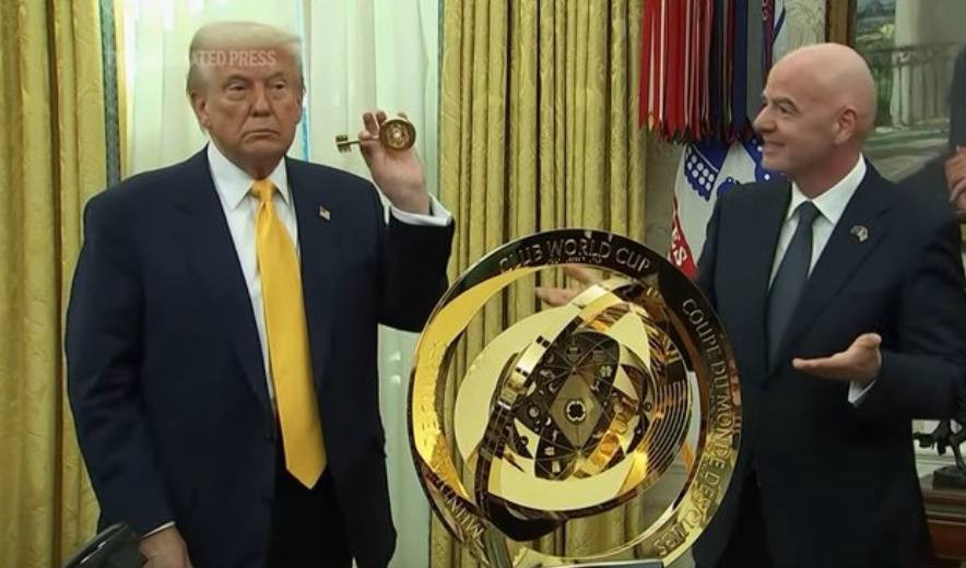 Trump holds up a gold “key” after receiving the sphere