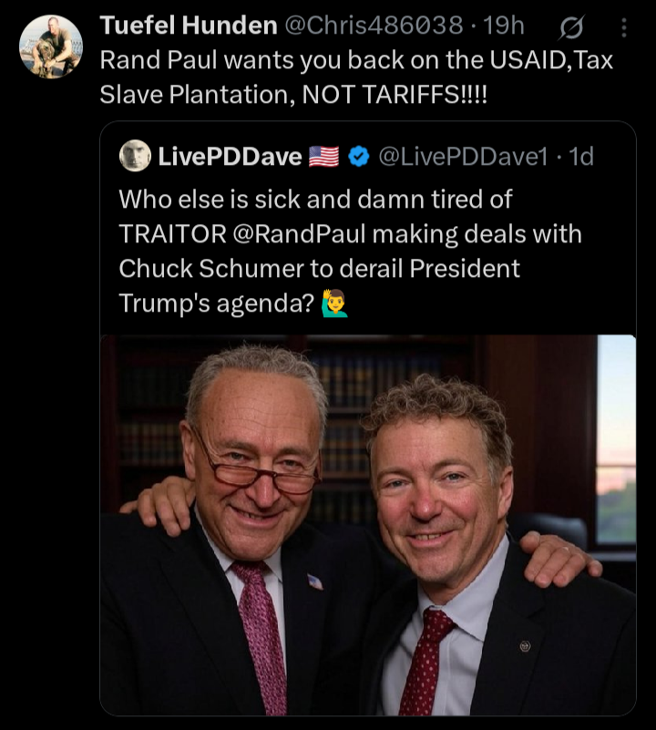 UPDATE; Congress held a vote today, 5/1/25, and voted Rand Paul's proposal down. Tariffs win the vote. Three Republicans joined Democrats in rejecting the tariffs: Sens. Lisa Murkowski of Alaska, Susan Collins of Maine and Rand Paul of Kentucky. Paul was a cosponsor of the resolution with Sen. Ron Wyden, an Oregon Democrat.