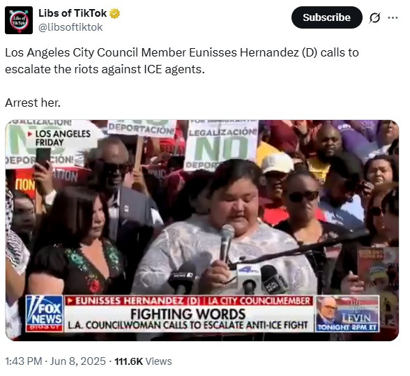 She is a government official and Calling for violence against federal agents, she should be arrested and removed from office. 😏 https://x.com/libsoftiktok/status/1931557768189690361