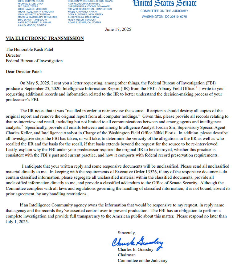 NEW: In a letter today to FBI Director Kash Patel, Sen Grassley asks for more documents related to China's interference in 2020 election. New info disclosed by Patel confirms CCP mass produced fake driver's licenses to obtain absentee ballots to vote for Joe Biden.