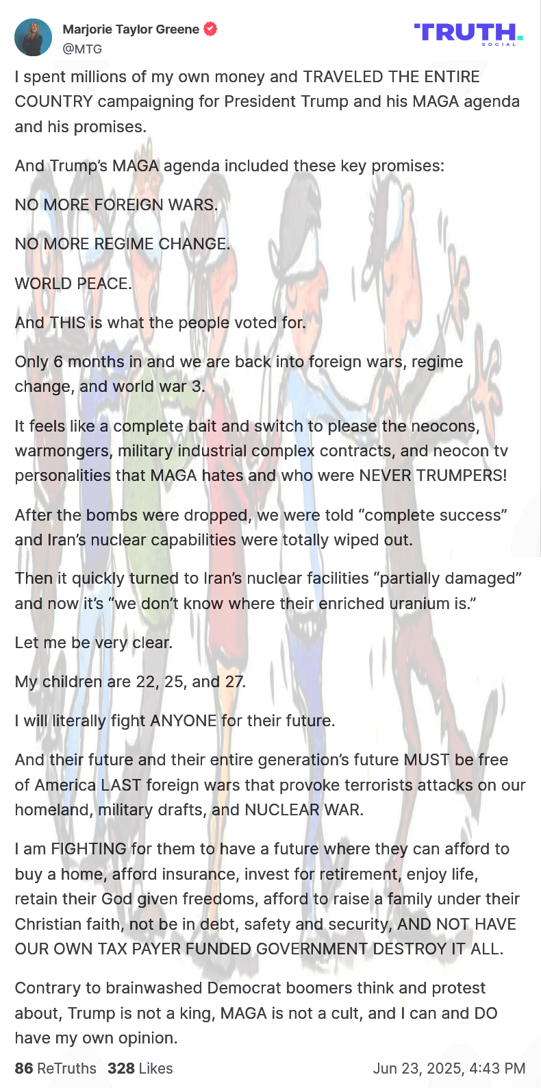 NGO s exposed, global child and drug trafficking shut down. Freak show done. And violent terrorists organizations, states get asses kicked. Isolation doesn't fix the forever war plan of the last century.