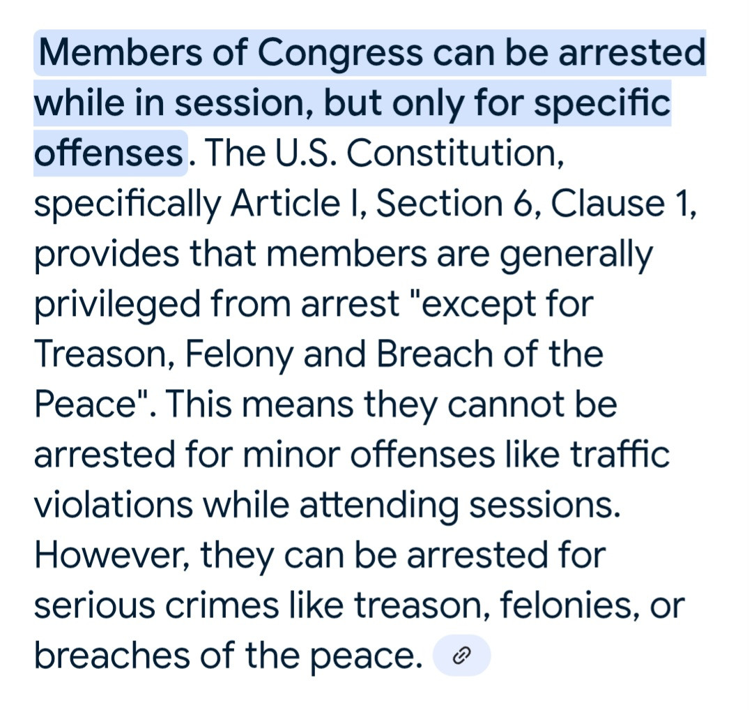 I thought I read somewhere that congress can’t be arrested while they are in session….
