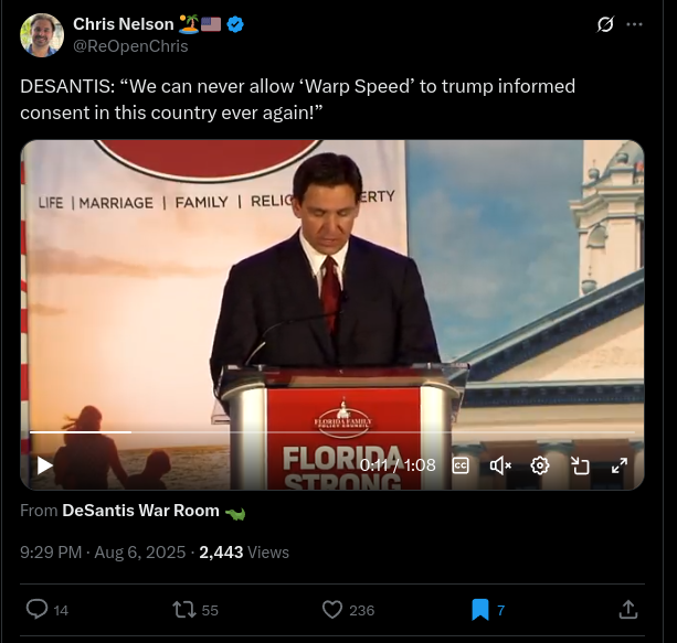 DESANTIS: “We can never allow ‘Warp Speed’ to "Trump" informed consent in this country ever again!”