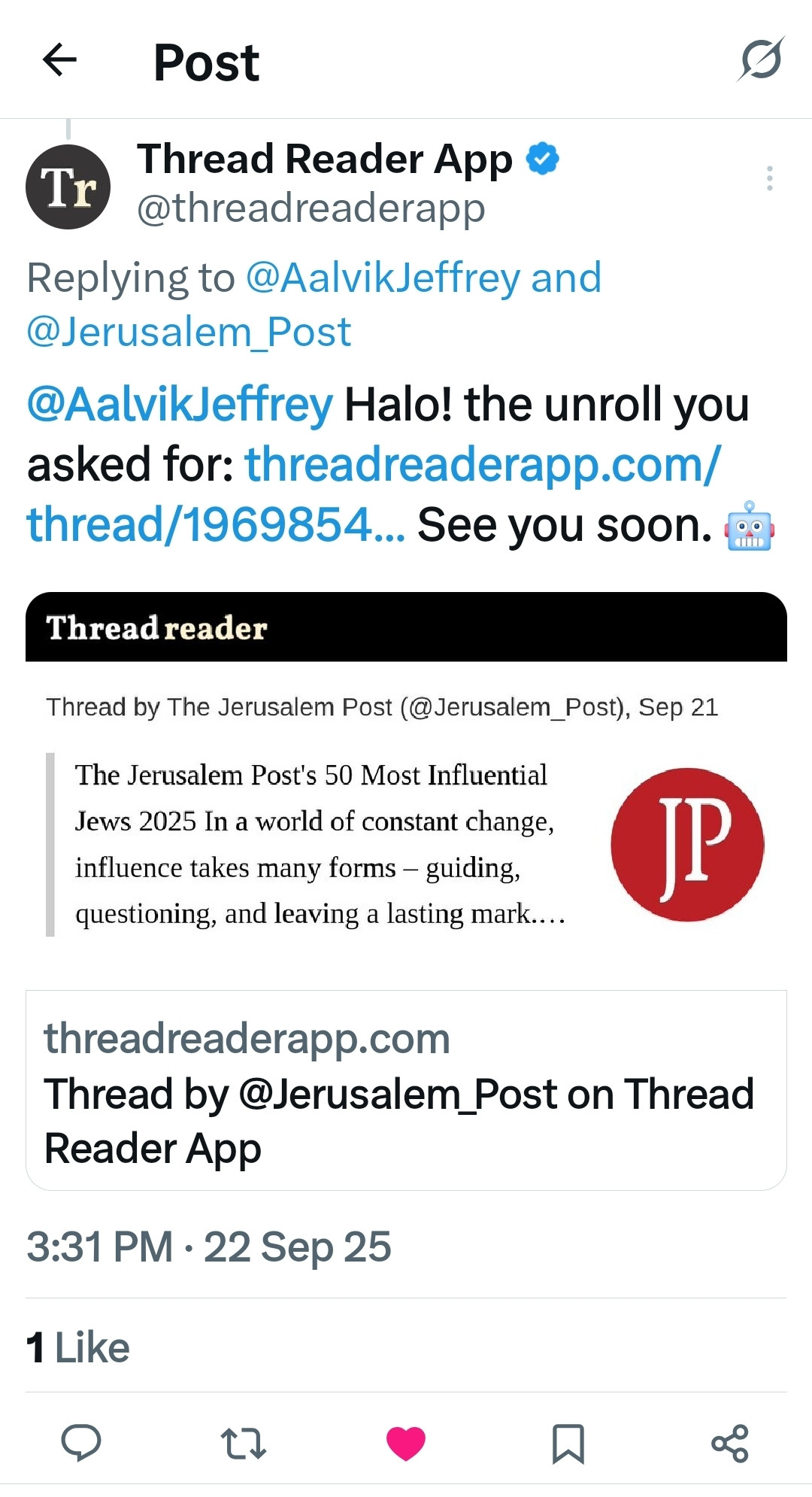 @AalvikJeffrey@Jerusalem_Post@AalvikJeffrey Halo! the unroll you asked for: https://t.co/KdK2suvnBK See you soon. 🤖