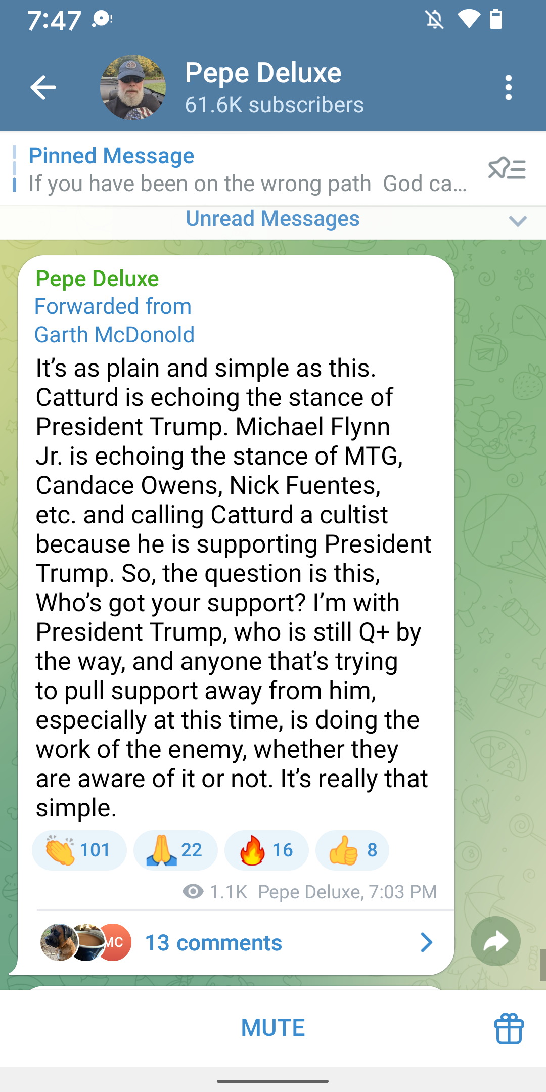For anti-Trump folks on AU, Iβm tired; Iβm not stupid; I worship no man; I trust certain things unless I am given a good reason not to; fog of war is real; we are past convincing anyone - at this point I encourage you to use your intuition with everything you see/hear; we thrive on truth and love rather than division or having to chose if we are with you or against you about any person or thing (as I recall, that is a dem game); we are allowed to compel or disagree; we hold the line; President Trump still has my vote in the next election and every election after that unless I am convinced that he sold us or any children down the river; I still believe in the oath I swore to uphold our Constitution; I have no idea who is truthing or telling lies anymore, so that means I am not playing the game and my intuition will lead me through this darkness. God Wins. That said, I am all ears on how you think we could do much better. Our cult taught us to think for ourselves. Best Cult Ever