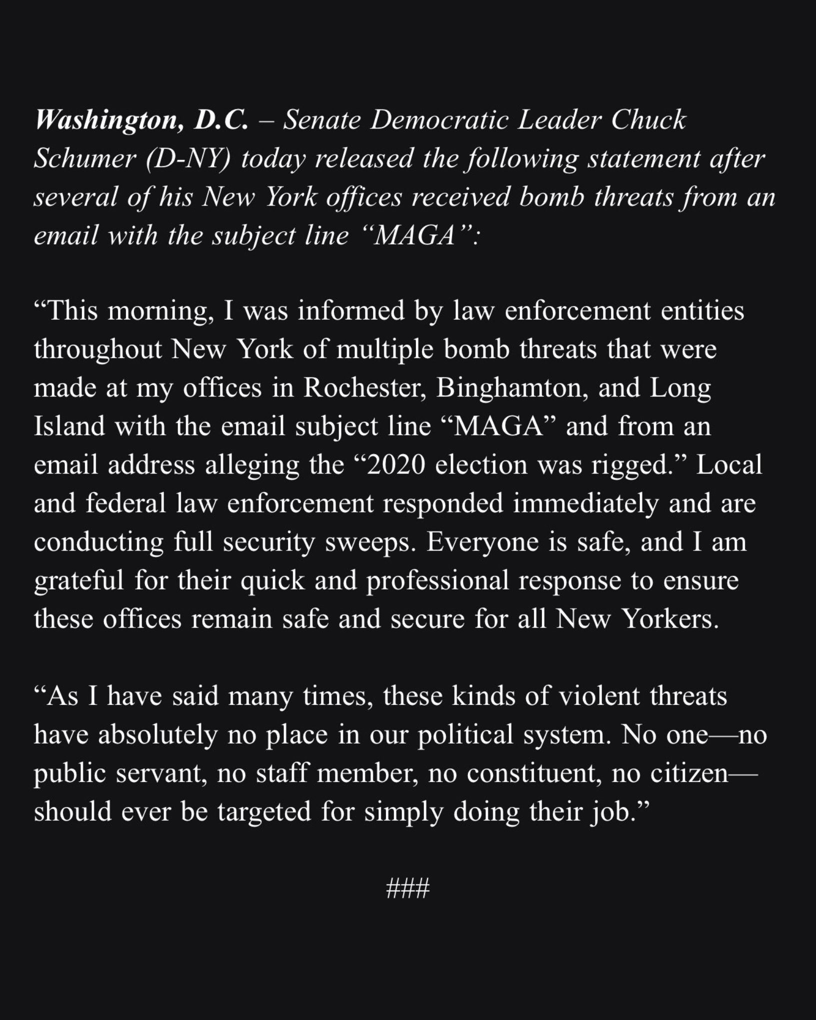Chuck Schumer claims someone made bomb threats to his NY Senate offices with "MAGA" in the email subject line, along with "2020 election was rigged"
