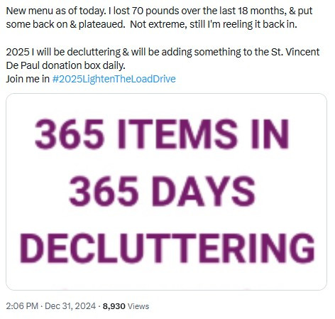 I decided to declutter and gave away some one thing every day this year to Saint Vincent DePaul and recorded it on X.