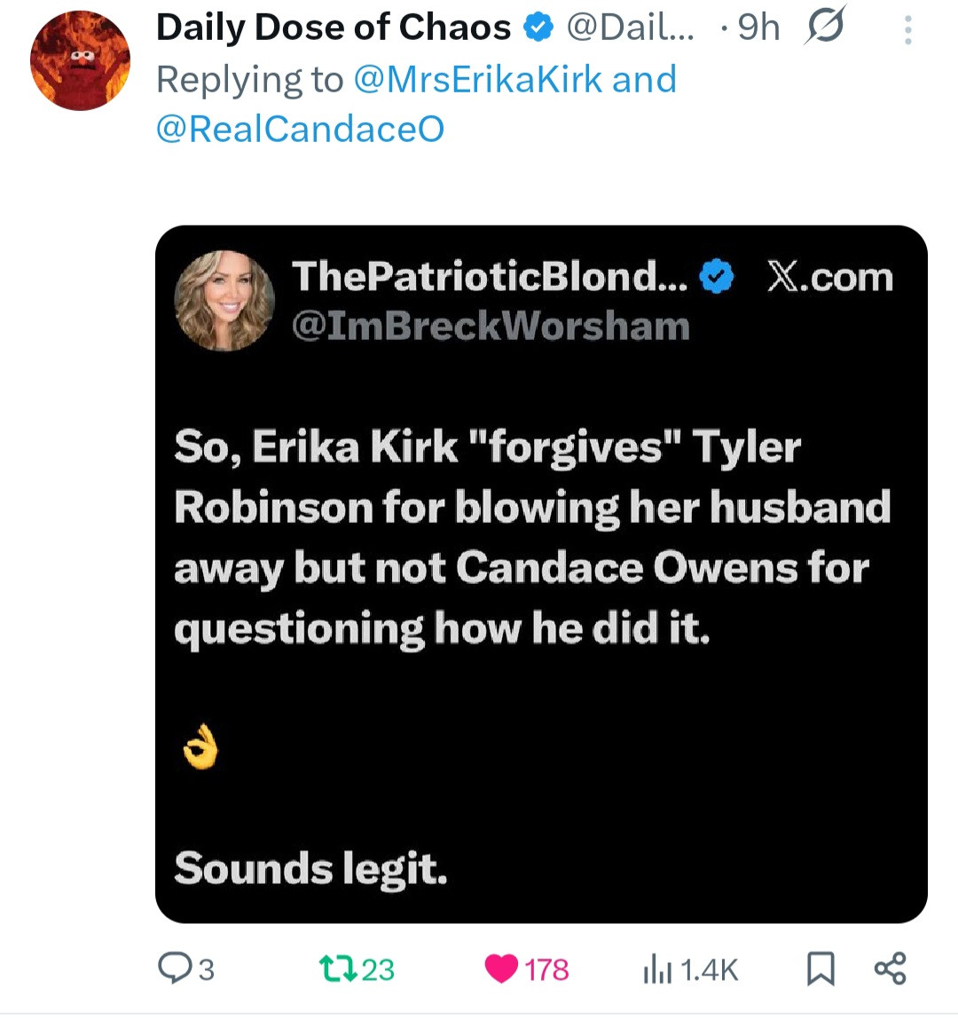 I think I understand. She called Tyler Robinson that young man. She considered him mentally deranged and not of sound mind, hence the forgiveness. She thinks Candace is in it for the money. I'm not agreeing with that. However, it is true, she has made money since Charlie's death. Candace wasn't invited to the funeral. Candace was plenty mad about that. I would like to know why Candace wasn't invited. I need more information about this.