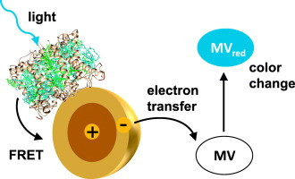 Transient absorption spectroscopy confirmed this notion and showed that electron transfer from QDs to MV is much faster than fluorescence energy transfer between LHCII and QD. The action spectrum of MV reduction by LHCII-QD complexes reflected the LHCII absorption spectrum, showing that light absorbed by LHCII and transferred to QDs increased the efficiency of MV reduction by QDs. Under continuous illumination, at least 28 turnovers were observed for the MV reduction. Presumably, the holes in QD cores were filled by a reducing agent in the reaction solution or by the dihydrolipoic-acid coating of the QDs. The LHCII-QD construct can be viewed as a simple model of a photosystem with the QD component acting as reaction center.